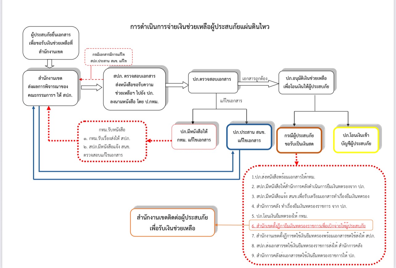 ทั้งนี้ กทม. ร่วมกับ ปภ. ได้ให้ความช่วยเหลือผู้ประสบภัย (แผ่นดินไหว) ในพื้นที่กรุงเทพฯ เสร็จสิ้นแล้ว 14 เขต ได้แก่ เขตคลองสามวา คันนายาว ดุสิต ตลิ่งชัน บางขุนเทียน บางบอน บึงกุ่ม ป้อมปราบศัตรูพ่าย พระนคร มีนบุรี สะพานสูง สัมพันธวงศ์ หนองแขม และเขตหนองจอก อย่างไรก็ตาม การจ่ายเงินช่วยเหลือเยียวยาอาจมีความล่าช้า เนื่องจากมีจำนวนผู้ประสบภัยจำนวนมาก หรือกรณีผู้ประสบภัยแจ้งความประสงค์รับความช่วยเหลือเป็นเงินสด จะมีขั้นตอนเพิ่มเติมดำเนินการมากกว่าการรับโอนเงินผ่านระบบธนาคารกรุงไทย จำกัด (มหาชน) (KTB) รวมถึงการประสานติดตามผู้ประสบภัยให้มารับเงินสดดังกล่าว