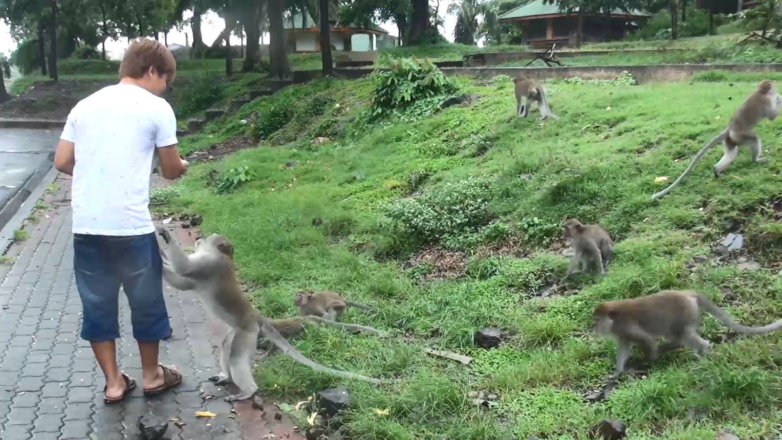 ในวันนี้มีนักท่องเที่ยวเดินทางพาครอบครัวมาท่องเที่ยวที่จังหวัดสงขลาซึ่งสามีเป็นชาวต่างชาติ มาซื้ออาหารให้ลิงกินทั้งกล้วย ข้าวโพดและถั่วอย่างเต็มที่ รวมทั้งซื้อให้นกพิราบกินด้วย