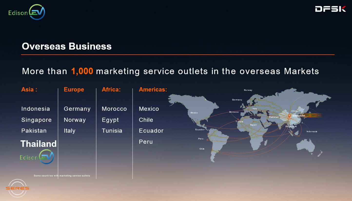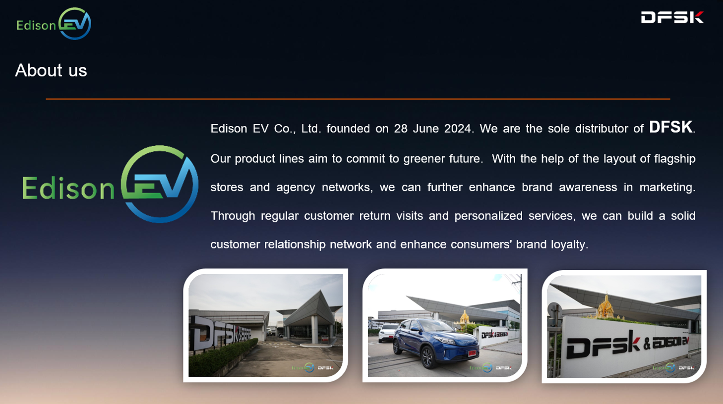 นางสาวธันย์จิรา ภูริชพุฒิพันธ์ ผู้จัดการทั่วไป บริษัท เอดิสัน อีวี จำกัด กล่าวว่า "Edison EV ก่อตั้งเมื่อ 28 มิถุนายน 2567 โดยได้รับการแต่งตั้งเป็นผู้จัดจำหน่ายแต่เพียงผู้เดียวของรถยนตไฟฟ้าแบรนด์ DFSK ในไทย ภายใต้การสนับสนุนจาก SERES Group ผู้ผลิตรถยนต์ไฟฟ้าชั้นนำของจีน ผ่าน DFSK (Chongqing Sokon Motor (Group) Import & Export Co., Ltd.) "