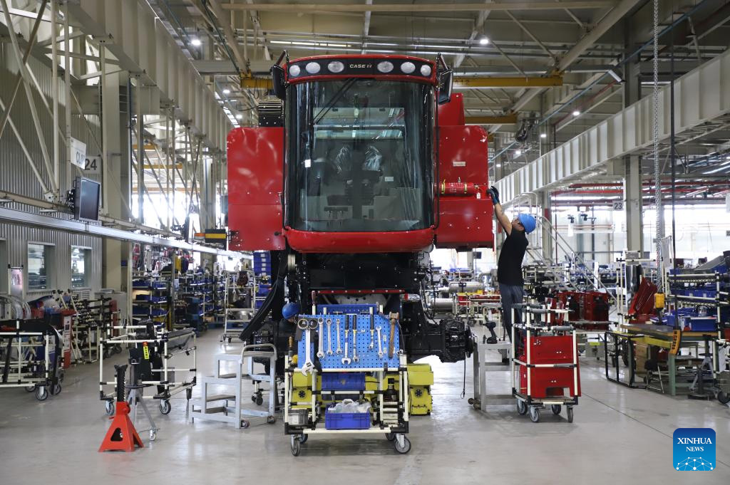 (แฟ้มภาพซินหัว : คนงานกำลังประกอบเครื่องเก็บเกี่ยวที่โรงงานอุตสาหกรรมเคส นิว ฮอลแลนด์ ในเขตผิงฝาง เมืองฮาร์บิน มณฑลเฮยหลงเจียง ทางตะวันออกเฉียงเหนือของจีน วันที่ 29 ส.ค. 2024)