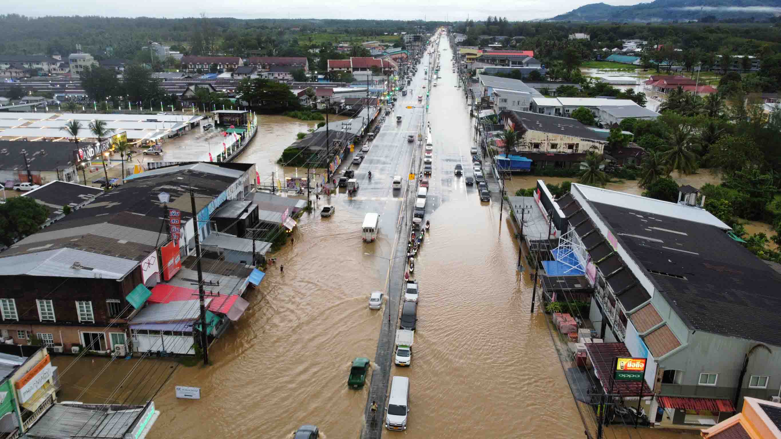 ล่าสุดเมื่อเวลา 16.00 น.วันที่ 22 ต.ค.68 นายพิชญ์พัทธ์ เรืองชาตรี นายอําเภอตะกั่วป่า ได้ลงพื้นที่ตรวจสอบเหตุน้ำป่าจากเทือกเขาหลักเขาโตนไหลหลากเข้าท่วมบ้านเรือนประชาชนและชุมชนแหล่งท่องเที่ยวและถนนเพชรเกษมสายอำเภอตะกั่วป่า - อำเภอท้ายเหมือง บริเวณย่านเขาหลักเขาหลักเซ็นเตอร์ นางทอง อำเภอตะกั่วป่า จังหวัดพังงา ซึ่งจากเหตุการณ์ที่น้ำป่าไหลหลากลงมาทำให้น้ำไหลท่วมร้านค้า ร้านอาหาร รถจักรยานยนต์และรถยนต์ที่จอดไว้บริเวณริมถนนทำให้ได้รับความเสียหายอย่างหนักซึ่งถือว่าเหตุการณ์ที่เกิดขึ้นในครั้งนี้หนักสุดในรอบ 20 ปีที่ผ่านมา ซึ่งจากเหตุการณ์น้ำป่าไหลหลากจากเทือกเขาหลัก เขาโตน มีประชาชนตั้งแต่หมู่ที่ 1 ถึงหมู่ที่ 7 ต.คึกคัก อ.ตะกั่วป่า ได้รับผลกระทบจากน้ำไหลหลากเข้าท่วมบ้านเรือนประชาชนที่อยู่ในพื้นที่ลุ่มต่ำและรถจักรยานรถยนต์ที่จอดอยู่บริเวณถนนเพชรเกษมซึ่งกระแสน้ำที่มีสีขุ่นเหลืองและไหลแรงจนทำให้รถถูกน้ำท่วมขังหลายคัน ส่วนรถตู้รับส่งนักท่องเที่ยวจากโรงแรมรีสอร์ทในเขาหลักที่จะเดินทางไปขึ้นเครื่องจังหวัดภูเก็ตต้องนำรถอีกคันมาสับเปลี่ยนพร้อมขนย้ายนักท่องเที่ยวขึ้นรถอีกฝั่งของถนนเพื่อเดินทางเข้าสู่จังหวัดภูเก็ต