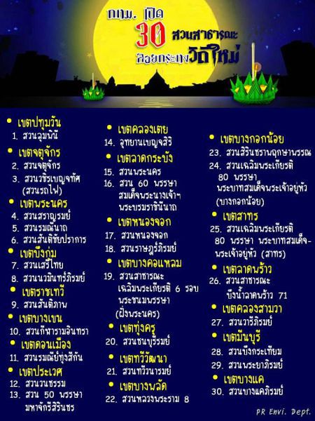 กทม.เผยพื้นที่จัดกิจกรรมลอยกระทง เปิดสวนสารณะทั่วกรุง30แห่งจัดงาน