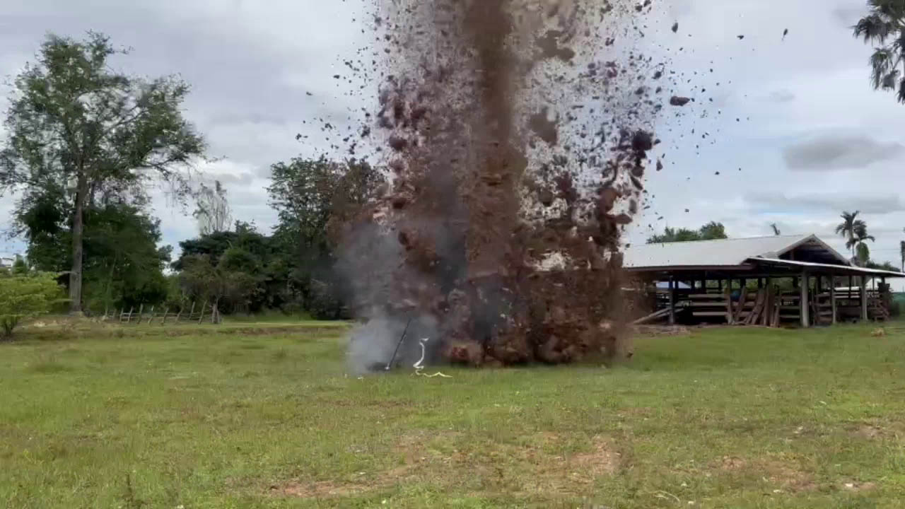 ศรีสะเกษ-เมื่อวันที่24 ตุลาคม 2568 ตั้งแต่เวลา 10.00 น. ที่บ้านผือ ม.9 ต.เมือง อ.กันทรลักษ์ จ.ศรีสะเกษ ร.ต.อ.ธีรภัท นามั่น หัวหน้าชุด EOD ตชด.22 ได้นำเจ้าหน้าที่ชุด EOD กก.ตชด.22 และเจ้าหน้ามี่ทหาร ทำการตรวจสอบวัตถุระเบิดที่ฝ่ายทหารกัมพูชายิงมาตกในพื้นที่บริเวณคอกเลี้ยงวัวของ น.ส.โชติกา ศิริภี ห่างจากปั้มน้ำมันที่เกิดเหตุลูกปืน BM21 ตกกลางร้านสะดวกซื้อประมาณ 200 เมตร เมื่อ วันที่ 24 ก.ค.68 ที่ผ่านมา เจ้าหน้าที่ชุด EOD.ตชด.22 ทำการตรวจหลุมต้องสงสัยลึกประมาณ 2 เมตร โดยใช้เครื่องแสกนหาวัตถุ แต่ไม่สามารถแสกนหาวัตถุต้องสงสัยได้ จึงต้องขุดลงไปอีก 1 เมตร เพื่อแสกนหาอีกครั้ง ก็ยังไม่พบ จึงใช้ดินระเบิดซีโฟเพื่อทำการระเบิดลงดิน แล้วทำการตรวจสอบชิ้นส่วนวัตถุทราบาว่าเป็นชิ้นส่วนของลูกจรวจ BM21 ที่ระเบิดไปแล้ว และแจ้งเจ้าของพื้นที่มาตรวจสอบเพื่อให้เกิดความสบายใจต่อไป