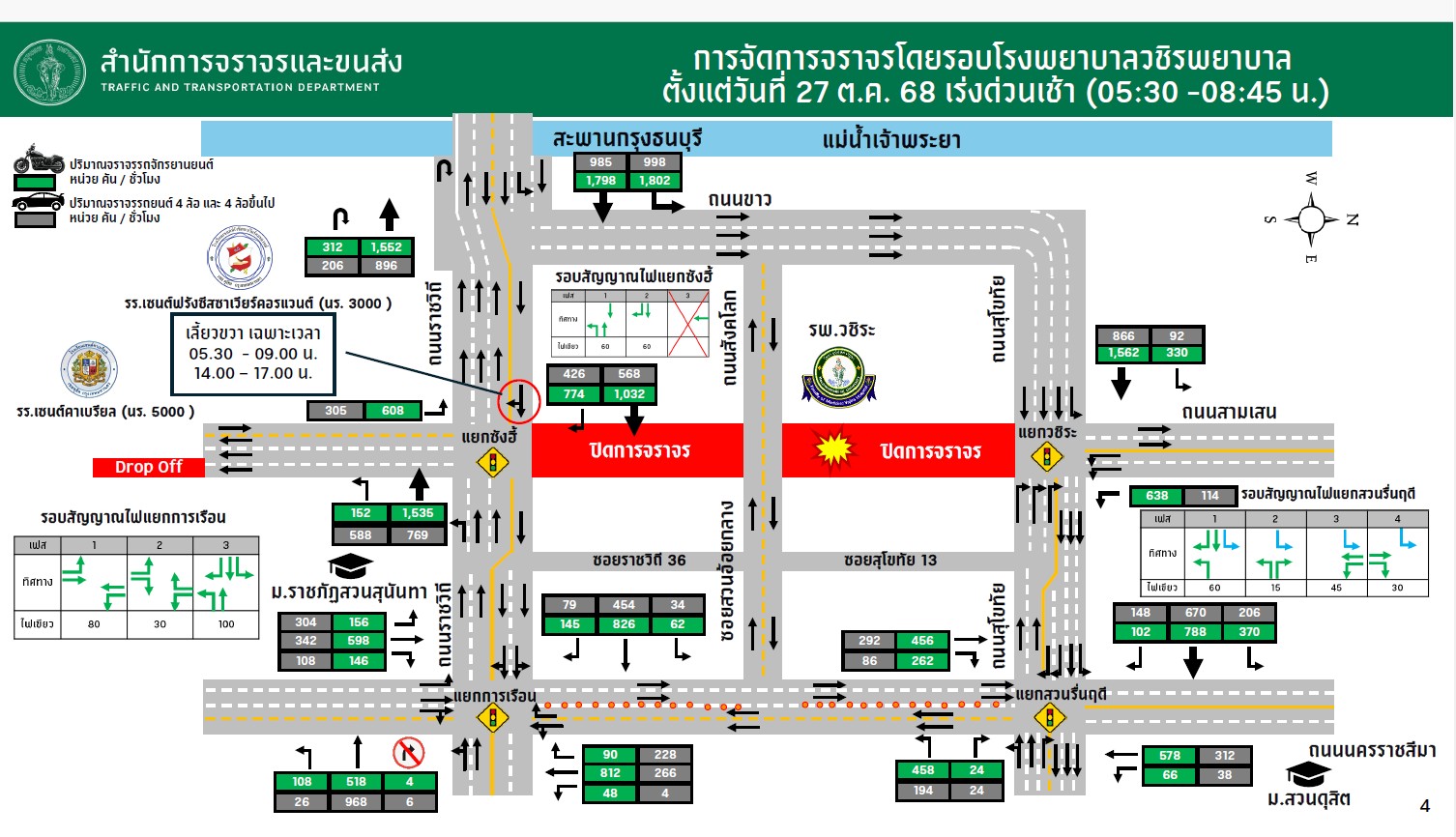 ด้านแผนการจัดการจราจรเฉพาะช่วง ได้มุ่งเน้นการใช้ถนนนครราชสีมาเพื่อรับปริมาณรถแทนถนนสามเสนที่ปิดถนน 100% ในช่วงเช้า (เวลา 05.30 – 09.00 น.) แยกซังฮี้ : รถขาเข้าจากสะพานซังฮี้ลงมาแยกซังฮี้ จะอนุญาตให้รถเลี้ยวขวาเพื่อเข้ากลุ่มโรงเรียนได้ โดยให้เฝ้าระวังและเตรียมพร้อมที่จะเปิดช่องทางพิเศษ (Reverse Lane) หากปริมาณรถติดขัดมากในเช้าวันเปิดเทอม แยกวชิระ/สวนรื่นฤดู : รถจากถนนขาวเข้าสุโขทัย จะเลี้ยวซ้าย 1 ช่องทาง และตรงไปสวนรื่นฤดี 3 ช่องทาง รถที่มาจากสามเสน (ย่านศรีย่าน) เพื่อเข้ากลุ่มโรงเรียน ต้องเลี้ยวซ้ายที่แยกวชิระ แล้วเลี้ยวขวาที่แยกสวนรื่นฤดี