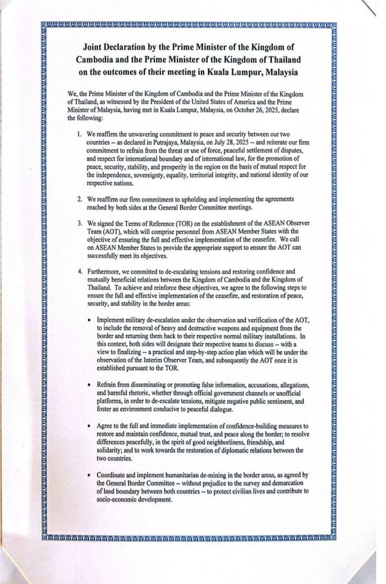 1) ผู้นำไทยและกัมพูชาแสดงเจตนารมณ์ต่อสันติภาพและความมั่นคงระหว่างสองประเทศ ตามที่เคยประกาศไว้ ณ เมืองปุตราจายา เมื่อ 28 กรกฎาคมที่ผ่านมา โดยย้ำความมุ่งมั่นที่จะละเว้นการคุกคามและใช้กำลัง แก้ไขข้อพิพาทโดยสันติ เคารพต่อเขตแดนและกฎหมายระหว่างประเทศ เพื่อส่งเสริมสันติภาพ เสถียรภาพ และความรุ่งเรืองร่วมกันในภูมิภาค