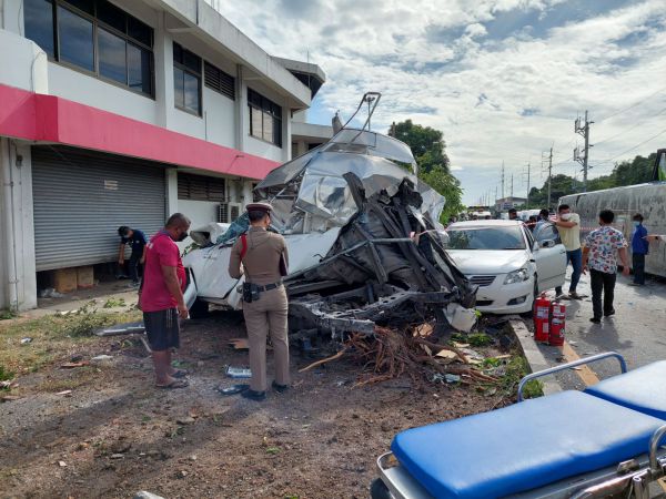 นครราชสีมา-รถบัสรับส่งพนักงานโรงงานโคราชเสียหลักพุ่งข้ามเกาะกลางถนนชนกระบะ 2 คันและรถเก๋งพังยับบาดเจ็บ 37 ราย