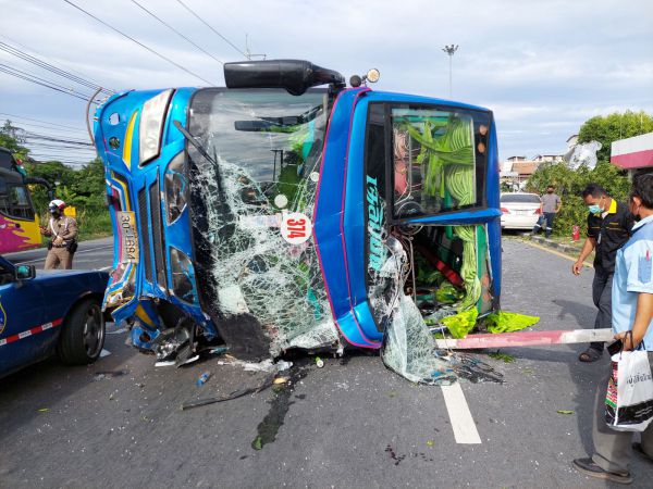 รถบัสรับส่งพนง.ซิ่งเสียหลักเหินข้ามเกาะ ชนดะ3คนรวดเจ็บ37ราย