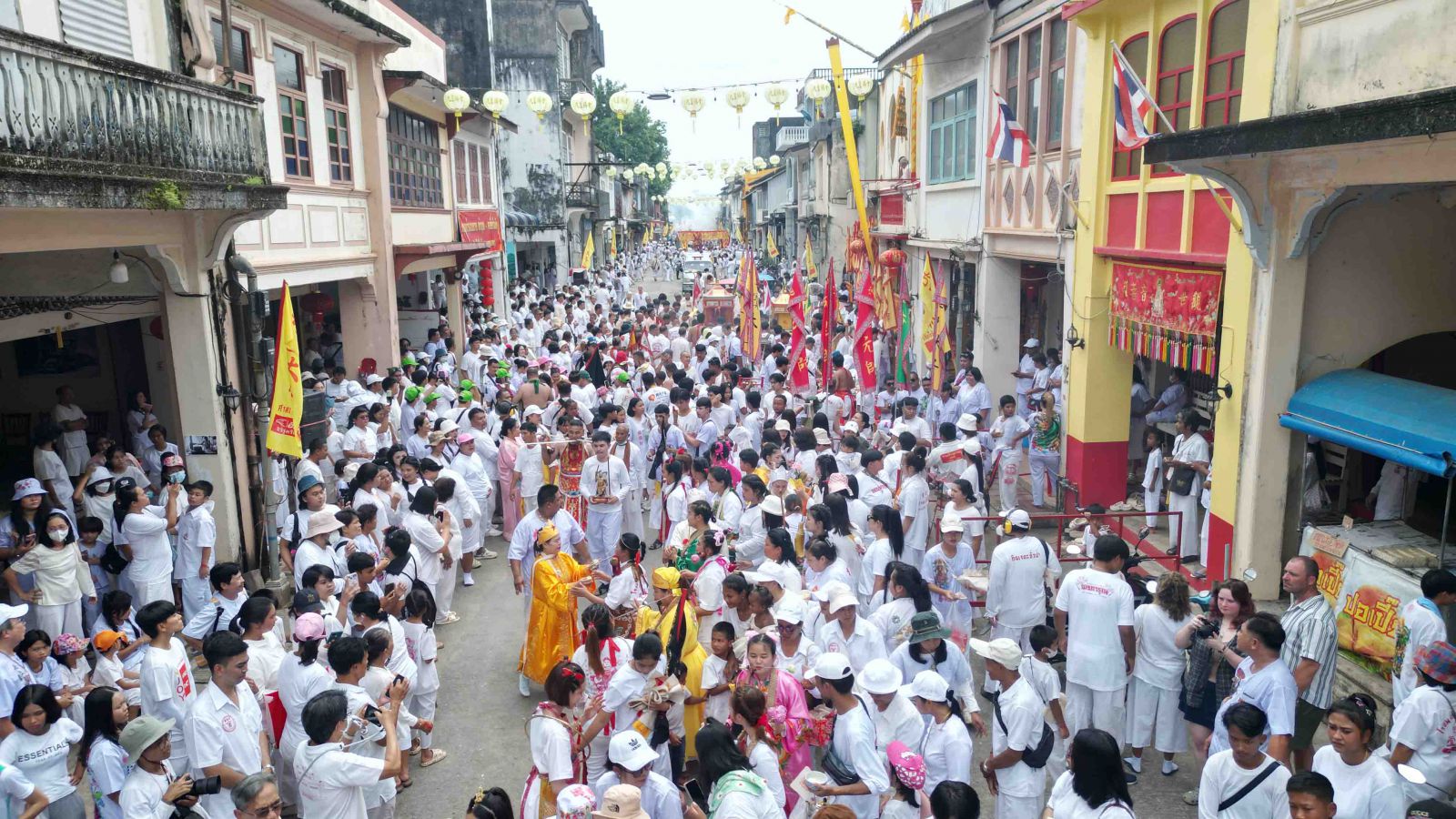 พังงา-เมื่อวันที่ 26 ตุลาคม 2568 ที่ถนนศรีตะกั่วป่า ย่านเมืองเก่าตะกั่วป่า จ.พังงา ศาลเจ้าพ่อกวนอู(ซิ่นไช่ตึ๋ง) พร้อมด้วยโรงพระตลาดเหนือ กู่ไช่ตึ๋ง และศาลเจ้าแม่กวนอิมตะกั่วป่า ประกอบพิธีอิ้วเก้ง หรือพิธีแห่พระรอบเมืองในวัน6ค่ำของประเพณีถือศีล-กินผัก ปี 2568 โดยบรรยากาศตลอดเส้นทางแห่เต็มไปด้วยเสียงประทัดกึกก้องและควันไฟขาวโพลน ชาวบ้านและนักท่องเที่ยวทั้งชาวไทยและต่างชาตินับพันคนออกมาตั้งโต๊ะน้ำชาและผลไม้มงคลหน้าบ้าน เพื่อรอรับขบวนแห่องค์เทพเจ้าจีนที่ประดิษฐานบนเกี้ยวหามโดยผู้ถือศีลกินผัก ซึ่งผลัดเปลี่ยนกันหามตลอดเส้นทางตามความเชื่อว่า “ผู้หามเกี้ยวจะได้รับสิริมงคลจากองค์เทพ” ไม่ว่าจะเป็นชาวบ้านทั่วไปหรือเศรษฐีในพื้นที่ ต่างสมัครใจมาร่วมหามด้วยแรงศรัทธา ซึ่งวิธีการหามเกี้ยวของชาวตะกั่วป่านั้นไม่เหมือนที่ไหนๆเป็นมรดกสืบทอดต่อๆกันมาหลายร้อยปี
