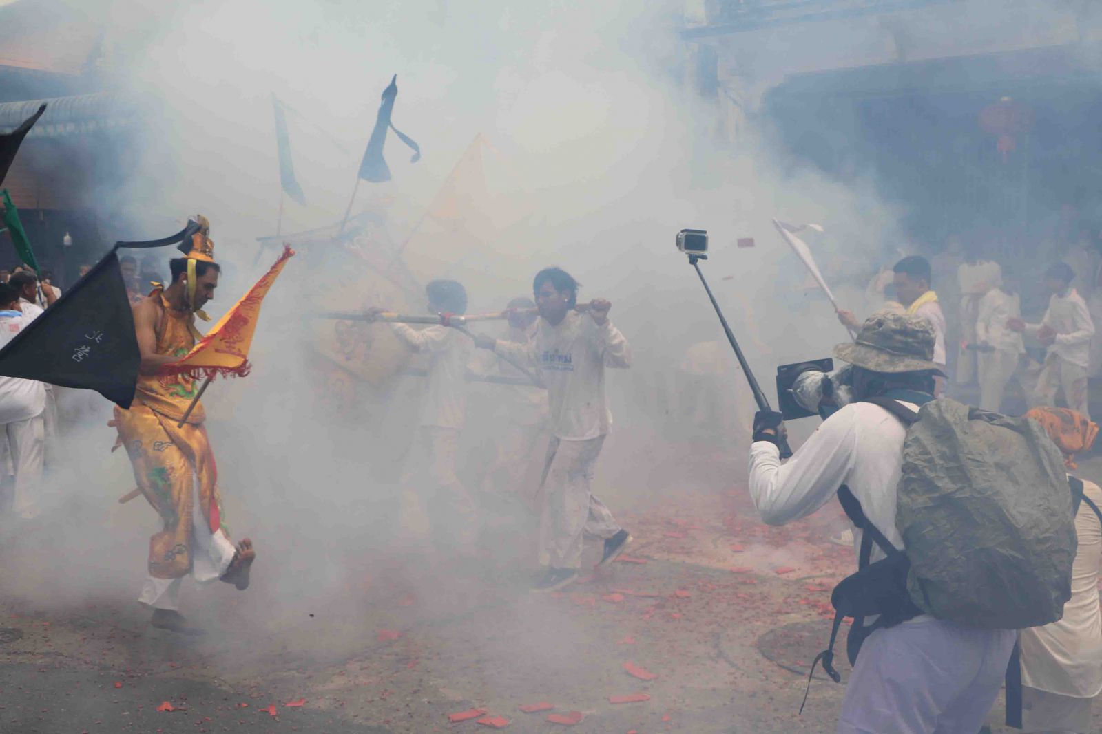 ไฮไลท์สำคัญของพิธี อยู่ที่บริเวณหน้าศาลเจ้าพ่อกวนอู (ซิ่นใช่ตึ๋ง)และหน้าศาลเจ้ากู่ไช่ตึ๋ง ซึ่งกลายเป็นจุดที่ผู้คนรอชมแน่นขนัด เสียงประทัดดังสนั่นราวกับฉากสงครามในภาพยนตร์ ชาวบ้านนับร้อยร่วมแรงกันโยนประทัดเข้าใส่ขบวนเกี้ยวอย่างต่อเนื่องไม่ขาดสายเสียงประทัดดังต่อเนื่องกว่า2ชั่วโมง คาดว่าปีนี้มีการจุดประทัดรวมกันมากกว่า 5 ล้านนัด หลังเสียงประทัดสงบลง เหล่าผู้หามเกี้ยวที่ทั้งตัวเต็มไปด้วยเขม่าควันและคราบประทัดเดินออกมาโดยปลอดภัย ซึ่งชาวบ้านเชื่อว่าเป็นเพราะ “ผู้ถือศีลอย่างเคร่งครัด” หรือที่เรียกว่า “เฉ้ง” จะได้รับการคุ้มครองจากสิ่งศักดิ์สิทธิ์ ขณะที่พื้นถนนที่ขบวนพระผ่าน กลายเป็นพรมสีแดงจากเศษประทัด-สัญลักษณ์แห่งความเป็นสิริมงคลที่ปกคลุมทั่วเมืองตะกั่วป่า