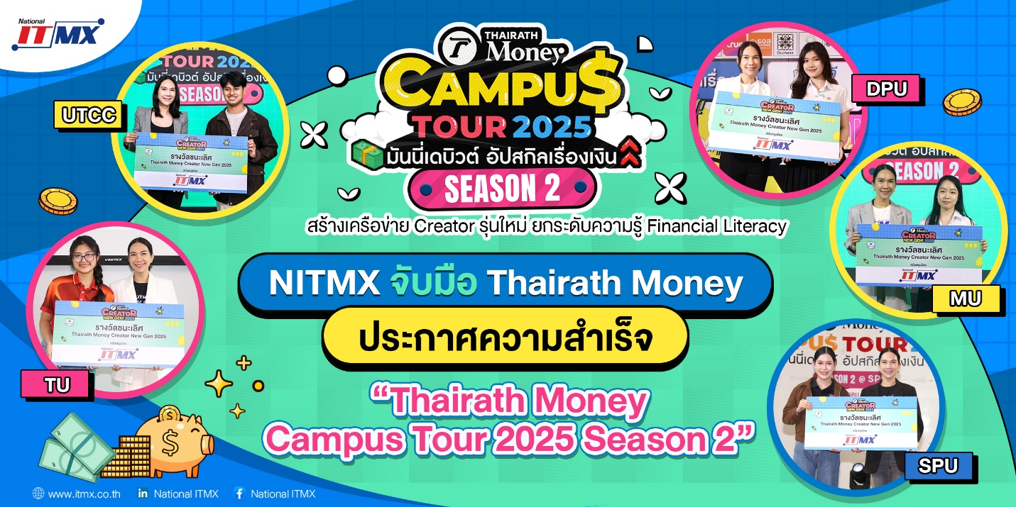 กรุงเทพฯ-ปิดฉากไปพร้อมความสำเร็จ! กับความร่วมมือระหว่าง บริษัท เนชั่นแนล ไอทีเอ็มเอ๊กซ์ จำกัด (NITMX) และ Thairath Money ในโครงการ “Thairath Money Campus Tour 2025 Season 2” ที่ตลอดเดือนตุลาคมได้เดินสายบุก 5 มหาวิทยาลัยทั่วประเทศ เพื่อสร้างแรงบันดาลใจให้คนรุ่นใหม่ก้าวสู่การเป็น “Creator สายการเงิน” ที่สามารถถ่ายทอดความรู้ด้านการเงิน การลงทุน และเทคโนโลยีทางการเงินได้อย่างสร้างสรรค์ เข้าใจง่าย และเข้าถึงคนทุกกลุ่ม ผ่านเวที “Thairath Money Creator Audition” ซึ่งเปิดโอกาสให้นักศึกษาผลิตคอนเทนต์สั้นตามโจทย์จาก NITMX ที่ครอบคลุมทั้งเรื่อง Personal Finance, Investment, Economics, Business Marketing และ Tech Innovation