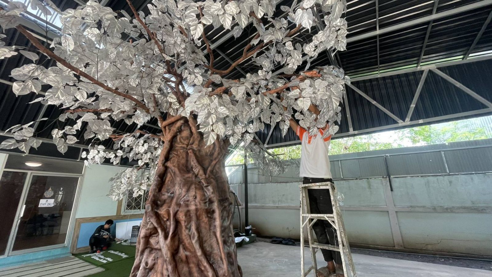 นครราชสีมา – นายสนธยา อ่อนน่วม เจ้าของ “สถาบันศิลปบ้านศิลปพบสุข” อำเภอเมือง จังหวัดนครราชสีมา เปิดเผยว่า ขณะนี้ได้มีหน่วยงานจากจังหวัดพระนครศรีอยุธยา ติดต่อสั่งผลิตงานศิลป์ “ต้นโพธิ์เงิน” เพื่อใช้ในการจัดแสดงแสดงความอาลัย สมเด็จพระนางเจ้าสิริกิติ์ พระบรมราชินีนาถ พระบรมราชชนนีพันปีหลวง ภายหลังเสด็จสวรรคต โดยชิ้นงานต้นโพธิ์เงินดังกล่าวสร้างจากวัสดุไฟเบอร์กลาส ความสูงกว่า 5 เมตร เส้นผ่าศูนย์กลางขนาดใหญ่สามคนโอบ และใช้สีพิเศษแบบ “สีแอร์บัส” เพื่อให้พื้นผิวมีมิติ เสมือนจริง คล้ายมีชีวิต