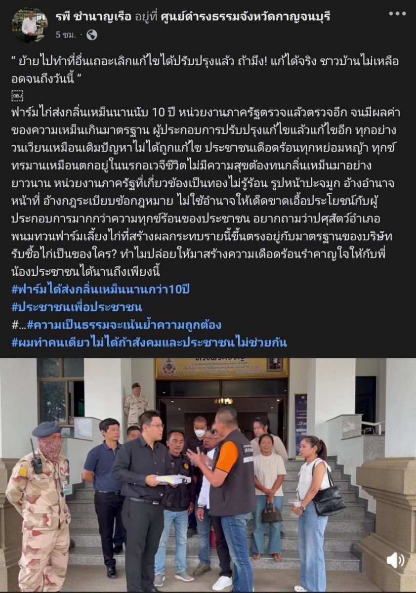 เมื่อวันที่ 14 พฤศจิกายน 2568 ที่ศูนย์ดำรงธรรมจังหวัดกาญจนบุรี นายรพี ชำนาญเรือ ในฐานะตัวแทนชาวบ้านตำบลดอนตาเพชร อำเภอพนมทวน ได้ยื่นหนังสือร้องเรียนอย่างเป็นทางการ ขอให้จังหวัดเร่งดำเนินการแก้ไขปัญหากลิ่นเหม็นรุนแรงจากฟาร์มไก่ที่สร้างความเดือดร้อนยาวนานกว่า 10 ปีนอกจากกลิ่นเหม็น ยังรุกล้ำพื้นที่ชลประทาน