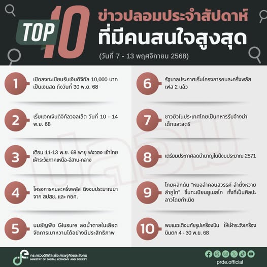 สำหรับอันดับ 1 เรื่อง “เปิดลงทะเบียนรับเงินดิจิทัล 10,000 บาท เป็นเงินสด ถึงวันที่ 30 พ.ย. 68” กระทรวงดีอี ประสานงานร่วมกับกลุ่มสารนิเทศการคลัง กระทรวงการคลัง ตรวจสอบพบว่า ไม่เป็นความจริง โดยขอชี้แจงว่าในขณะนี้ยังไม่มีโครงการใดๆ ที่เกี่ยวข้องกับการลงทะเบียนรับเงินดิจิทัล 10,000 บาท แต่อย่างใด ดังนั้น การให้ข้อมูลดังกล่าว จึงเป็นการให้ข้อมูลเท็จที่อาจสร้างความเข้าใจผิดแก่ประชาชน โดยขอให้ประชาชนติดตามข่าวสารจากหน่วยงานที่น่าเชื่อถือ และมีการตรวจสอบข้อเท็จจริง เพื่อการรับข้อมูลที่ถูกต้องและขออย่าส่งต่อข้อมูลที่ไม่เป็นความจริง เพราะอาจสร้างความสับสนและทำให้ผู้อื่นได้รับข้อมูลที่ผิดได้