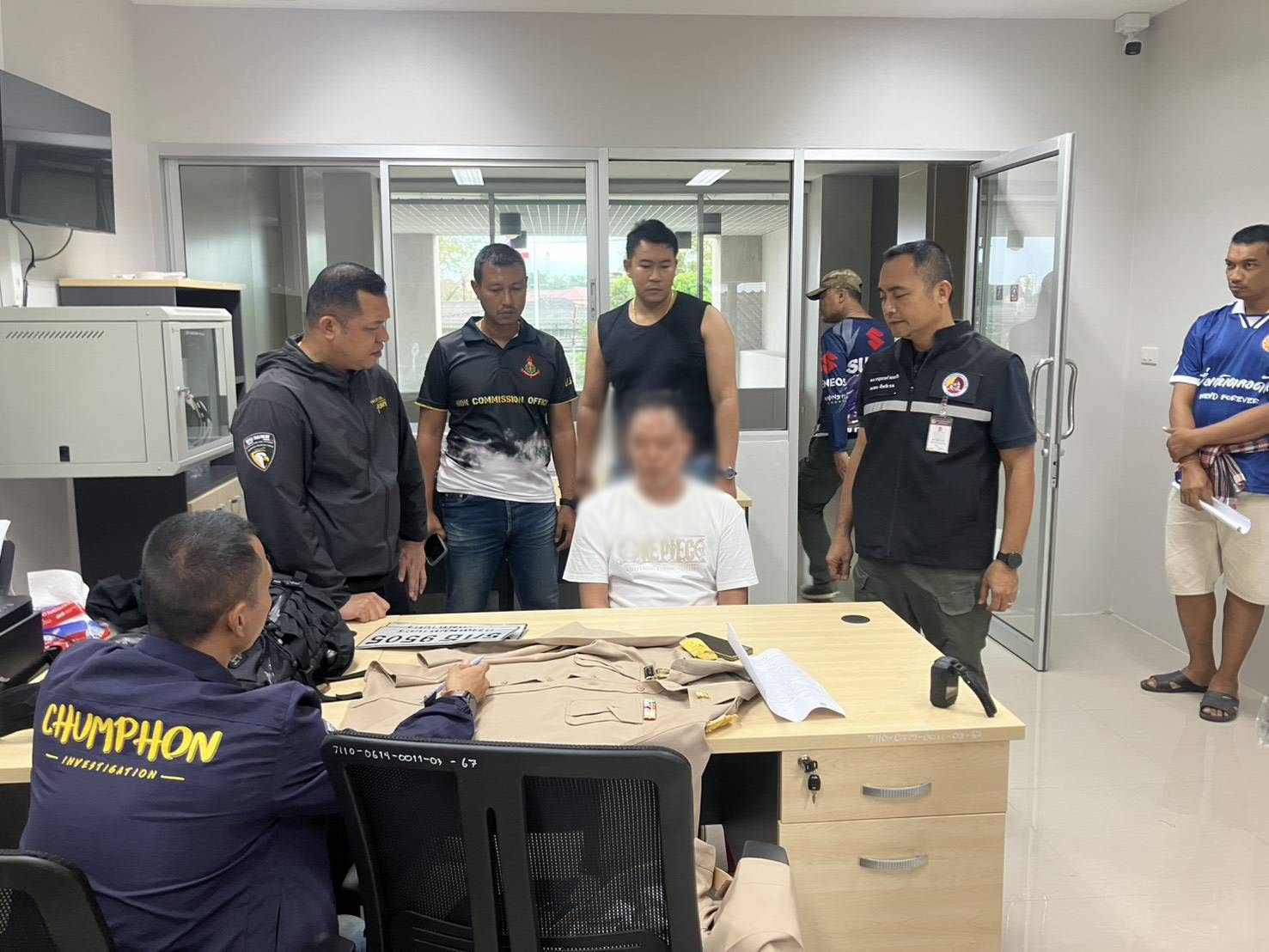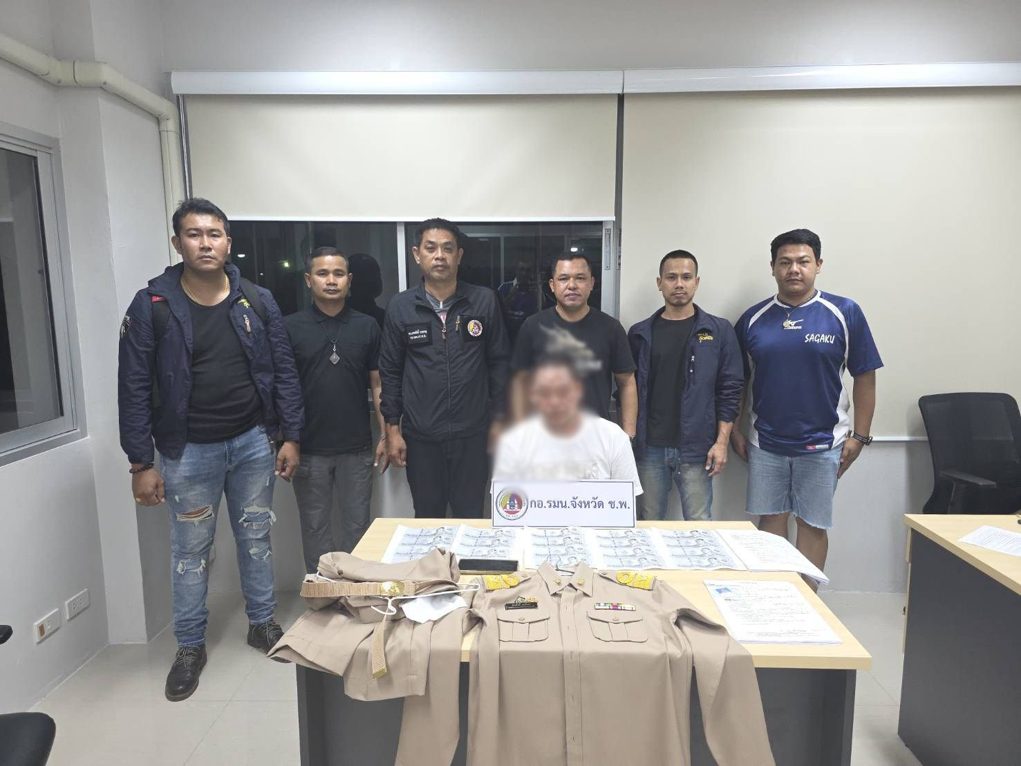 วันที่ 15 พ.ย.68 มีรายงานว่าเจ้าหน้าที่ กอ.รมน.จังหวัดชุมพร ภายใต้การอำนวยการของ พ.อ.นิพนธ์ อินใหม่ รอง ผอ.รมน.จังหวัดชุมพร (ฝ่ายทหาร) นำโดย พ.ท.ชาญณรงค์ ทองแก้ว หน.ฝ่ายข่าว ,พ.ต.กอบศักดิ์ นาคหาญ หน.ชรต.403 ,จ.ส.อ.อรรถพล คลี่บำรุง, จ.ส.อ.พงศ์ศิลป์ รุ่งอาญา, จ.ส.อ.ธนวรธน์ บรรรจงศิริทัศน์ สนธิกำลังร่วมกับตำรวจชุดสืบสวน ภ.จว.ชุมพร จับกุมตัว นายจิระศักดิ์ หรือหนุ่ม จันทร์จ้อย อายุ 42 ปี ที่อยู่ 8/1 ชอย 9 ถนนพูลศิริ ต.นาสาร อ.บ้านนาสาร จ.สุราษฎร์ธานี พร้อมด้วยของกลาง 1. ธนบัตรฉบับละ 1,000 บาท ที่ใช้ในการล่อซื้อ จำนวน 15 ฉบับ รวมมูลค่า 15,000 บาท 2.ชุดเครื่องแบบราชการสีกากี และป้ายชื่อ ระบุตำแหน่งหัวหน้าภาคเฉพาะกิจในส่วนพระราชวัง พร้อมประดับเครื่องหมายอื่นๆ และของกลางอื่นๆที่เกี่ยวข้องกับพฤติกรรมการทำผิด อีกหลายรายการ หลังหลอกเหยื่อจ่ายเงินจ่ายเงินแสนฝากเข้าทำงานเป็นเจ้าหน้าที่รัฐอยู่ในสังกัด กอ.รมน.