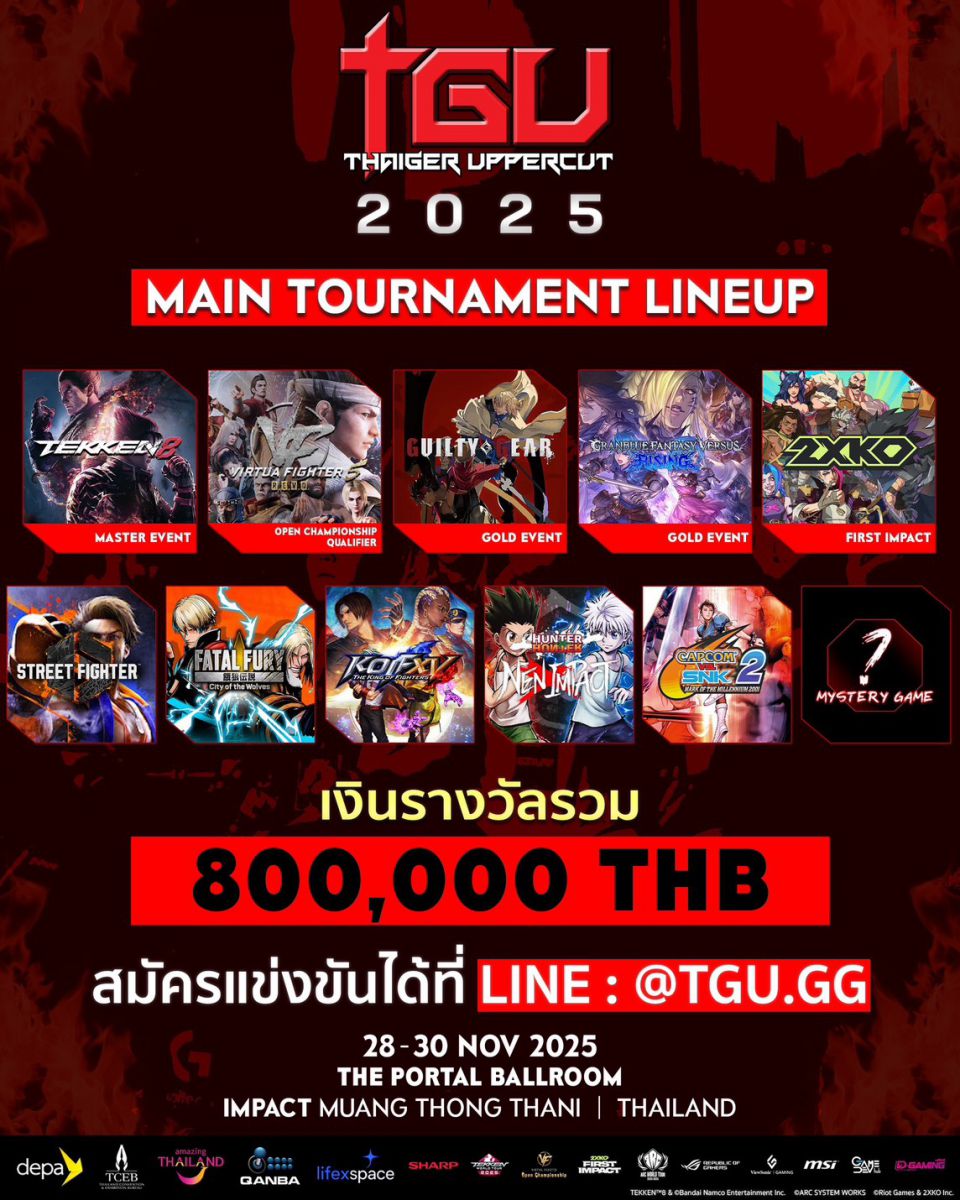TGU 2025 งานแข่งขันเกมต่อสู้สุดยิ่งใหญ่ประจำปี โดยงานนี้จัดเต็มความสนุกตลอด 3 วันเต็ม จะมีขึ้นในวันที่ 28-30 พฤศจิกายน ณ The Portal Ballroom, อิมแพคเมืองทองธานี โดยในปีนี้เป็นงานที่รวบรวมสนามแข่งขันสุดแสนสำคัญไว้หลายรายการ ซึ่งล้วนเป็นเส้นทางสำคัญของผู้เล่นทุกคนที่จะไปแข่งขันต่อในเวทีระดับโลก และเงินรางวัลรวมมากกว่า 800,000 บาท พร้อมทั้งของรางวัลอื่น ๆ อีกมากมาย โดย ตัวอย่างเกมในปีนี้ อาทิเช่น