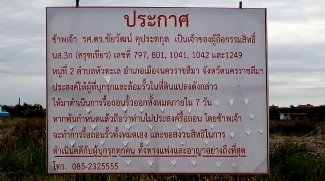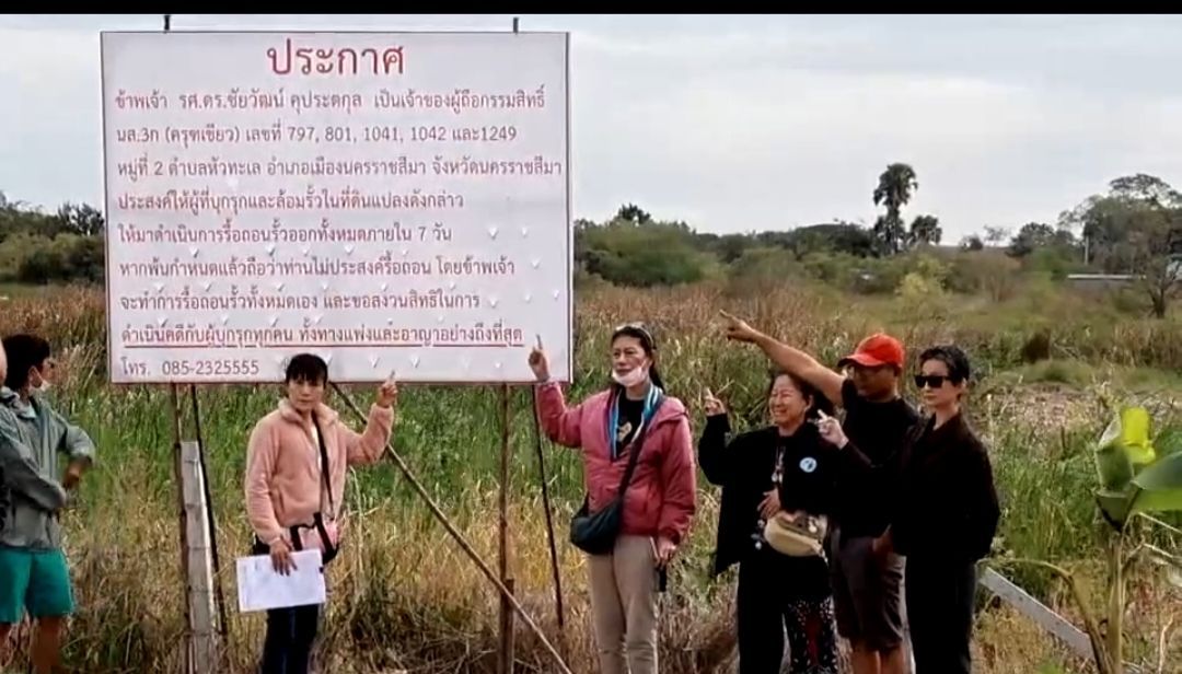 ซึ่งบุคคลดังกล่าวได้มาติดตั้งป้ายประกาศว่าเป็นที่ดินส่วนบุคคลห้ามผู้ใดมารุกล้ำเด็ดขาดพร้อมปิดประกาศว่าเป็นเจ้าที่ดินมีโฉนดเลขที่พร้อมจำนวน 5 แปลงเนื้อที่ประมาณ 60 กว่า และได้ดำเนินการแจ้งความกล่าวโทษครอบครัวตนในข้อหาบุกรุก ไว้ที่ สภ.เมืองนครราชสีมา ซึ่งเรื่องนี้ตนเองและคุณแม่ไม่เข้าใจในเมื่อพ่อของตนเองได้ซื้อที่กับนายสนั่น ไว้ตั้งแต่ปี 2503 และมีการออกเอกสารสิทธิ์ นส.3 เมื่อปี 2509ตนและครอบครัวก็ครอบครองที่ผืนดังกล่าวมาโดยตลอด ในสมัยคุณพ่อยังมีชีวิตอยู่ได้มอบที่ดินบางส่วนให้กับเทศบาลนครราชสีมา เพื่อทำเป็นสถานที่บำบัดน้ำเสีย แต่ปัจจุบันเป็นเขตรับผิดชอบของเทศบาลตำบลหัวทะเล อเมือง จ.นครราชสีมา ซึ่งตนเองและผู้เป็นแม่ได้ขอเข้าไปตรวจสอบเอกสารสิทธิ์ที่ผืนดังกล่าวกับสำนักงานที่ดินจังหวัดนครราชสีมา ว่าที่ดินของตนเองนั้นมีการออกเอกสารสิทธิ์ซับซ้อนที่ดินของตนเองหรือ ซึ่งเรื่องนี้หากไม่ได้ความกระจ่างจากสำนักงานที่ดินจังหวัดนครราชสีมา ตนเองจะให้ทนายความคำร้องขอความเป็นธรรมเพื่อให้ศาลเป็นผู้พิจารณาสอบหาข้อเท็จจริงในเรื่องที่แปลงนี้ต่อไป
