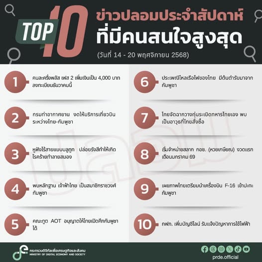 กรุงเทพฯ-กระทรวงดิจิทัลเพื่อเศรษฐกิจและสังคม (ดีอี) ตรวจพบข่าวปลอมรายสัปดาห์ ที่ประชาชนให้ความสนใจสูงสุดอันดับที่ 1 เรื่อง “คนละครึ่งพลัส เฟส 2 เพิ่มเงินเป็น 4,000 บาท ลงทะเบียนธันวาคมนี้” รองลงมาคือเรื่อง “กรมท่าอากาศยาน งดให้บริการเที่ยวบิน ระหว่างไทย-กัมพูชา” เตือนประชาชน อย่าหลงเชื่อข่าวปลอม อาจทำให้เกิดความเข้าใจผิด สับสน ตื่นตระหนก และวิตกกังวลในสังคม รวมทั้งอาจทำให้สูญเสียทรัพย์สิน และข้อมูลส่วนบุคคล ขอให้เลือกเชื่อ เลือกแชร์ ข้อมูลที่เป็นประโยชน์