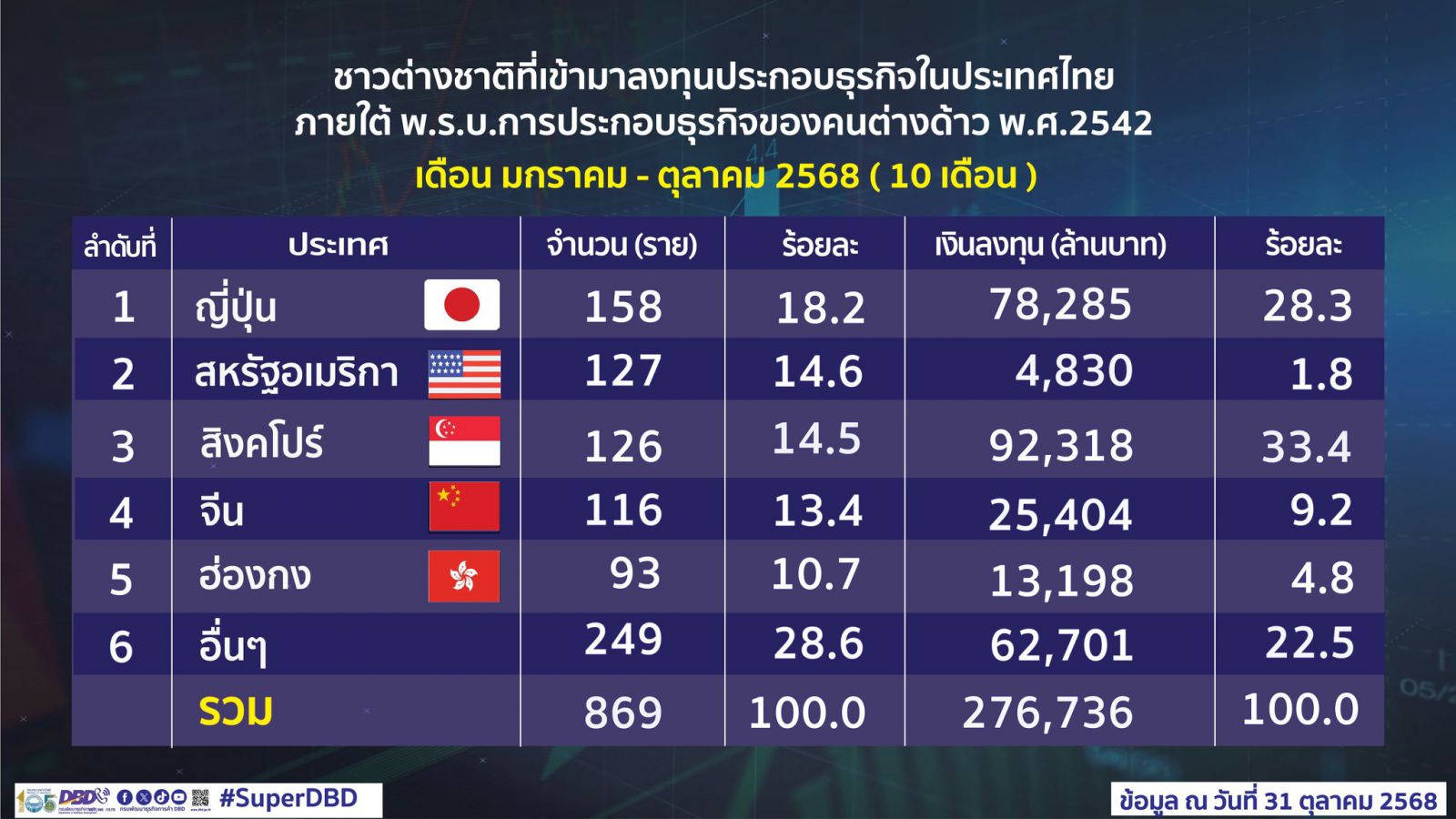 นายพูนพงษ์ นัยนาภากรณ์ อธิบดีกรมพัฒนาธุรกิจการค้า กระทรวงพาณิชย์ ในฐานะเลขานุการคณะกรรมการการประกอบธุรกิจของคนต่างด้าว เปิดเผยว่า ช่วง 10 เดือนของปี 2568 (มกราคม - ตุลาคม) มีการอนุญาตให้คนต่างชาติเข้ามาลงทุนประกอบธุรกิจในประเทศไทย ภายใต้พระราชบัญญัติการประกอบธุรกิจของคนต่างด้าว พ.ศ. 2542 จำนวน 869 ราย โดยเป็นการลงทุนผ่านช่องทางการขอรับใบอนุญาตประกอบธุรกิจของคนต่างด้าว 228 ราย และการขอหนังสือรับรองการประกอบธุรกิจของคนต่างด้าว (ผ่านช่องทางการลงทุนตามกฎหมายว่าด้วยการส่งเสริมการลงทุน หรือ ได้รับอนุญาตตามกฎหมายว่าด้วยการนิคมอุตสาหกรรมแห่งประเทศไทย และการใช้สิทธิตามสนธิสัญญาหรือความตกลงระหว่างประเทศ) 641 ราย มูลค่าเงินลงทุนรวมทั้งสิ้น 276,736 ล้านบาท โดยมีจำนวนชาวต่างชาติที่เข้ามาลงทุน 5 อันดับแรก ได้แก่