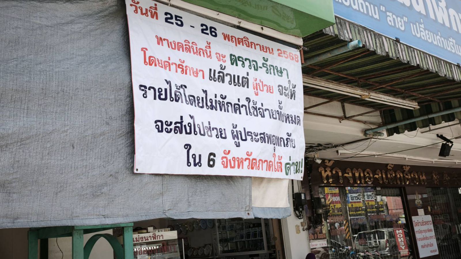 กระบี่-วันที่ 26 พ.ย.68ที่คลินิกหมอสมเกียรติ หรือที่รู้จักกันในนามคลินิกหมอใจบุญศูนย์บาท ถ.มหาราช ต.ปากน้ำ อ.เมือง จ.กระบี่ ของนายแพทย์สมเกียรติ กิจธรรมเชษฐ์ ได้ขึ้นป้ายที่ด้านหน้าคลินิก มีข้อความว่า ค่าตรวจรักษาในวันที่ 25-26 พ.ย.นี้ ทางคลินิกจะตรวจรักษา โดยค่ารักษาแล้วแต่ผู้ป่วยจะให้ รายได้ไม่หักค่าใช้จ่ายทั้งหมดจะส่งไปช่วยผู้ประสบภัยน้ำท่วมจังหวัดชายแดนใต้