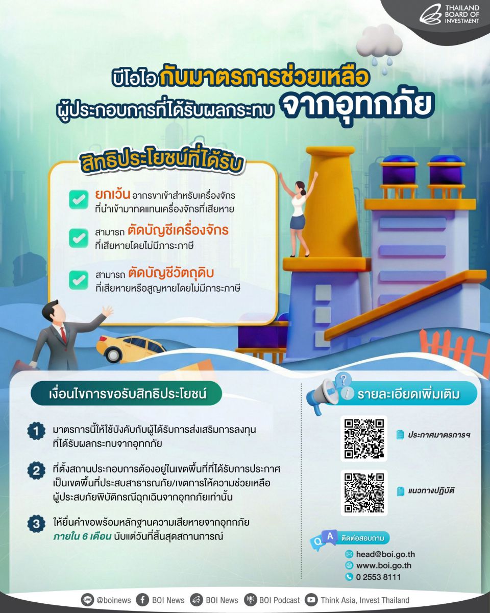 นายนฤตม์ เทอดสถีรศักดิ์ เลขาธิการคณะกรรมการส่งเสริมการลงทุน (บีโอไอ) เปิดเผยว่าจากเหตุอุทกภัยครั้งใหญ่ที่ก่อให้เกิดผลกระทบกับชีวิตและทรัพย์สินของพี่น้องประชาชนอย่างรุนแรง บีโอไอขอเป็นกำลังใจให้กับพี่น้องประชาชนและผู้ประกอบการทุกท่าน และบีโอไอมีมาตรการที่จะช่วยบรรเทาผลกระทบด้านเศรษฐกิจและช่วยเหลือผู้ประกอบการที่ได้รับผลกระทบจากอุทกภัยเพื่อบรรเทาความเดือดร้อนและสนับสนุนการฟื้นฟูธุรกิจในส่วนที่บีโอไอสามารถดำเนินการได้ผ่าน “มาตรการช่วยเหลือผู้ได้รับการส่งเสริมการลงทุนที่ได้รับผลกระทบจากอุทกภัย”ซึ่งบีโอไอได้ประกาศไว้ตั้งแต่ปี 2567 โดยให้สิทธิยกเว้นอากรขาเข้าเครื่องจักรทดแทนเครื่องจักรที่เสียหาย การตัดบัญชีเครื่องจักรและวัตถุดิบที่ได้รับความเสียหายโดยไม่มีภาระภาษี รวมถึงการอนุญาตให้เพิ่มกำลังการผลิตตามเครื่องจักรที่ซื้อเพิ่มหรือทดแทนเครื่องจักรเดิมที่เสียหาย