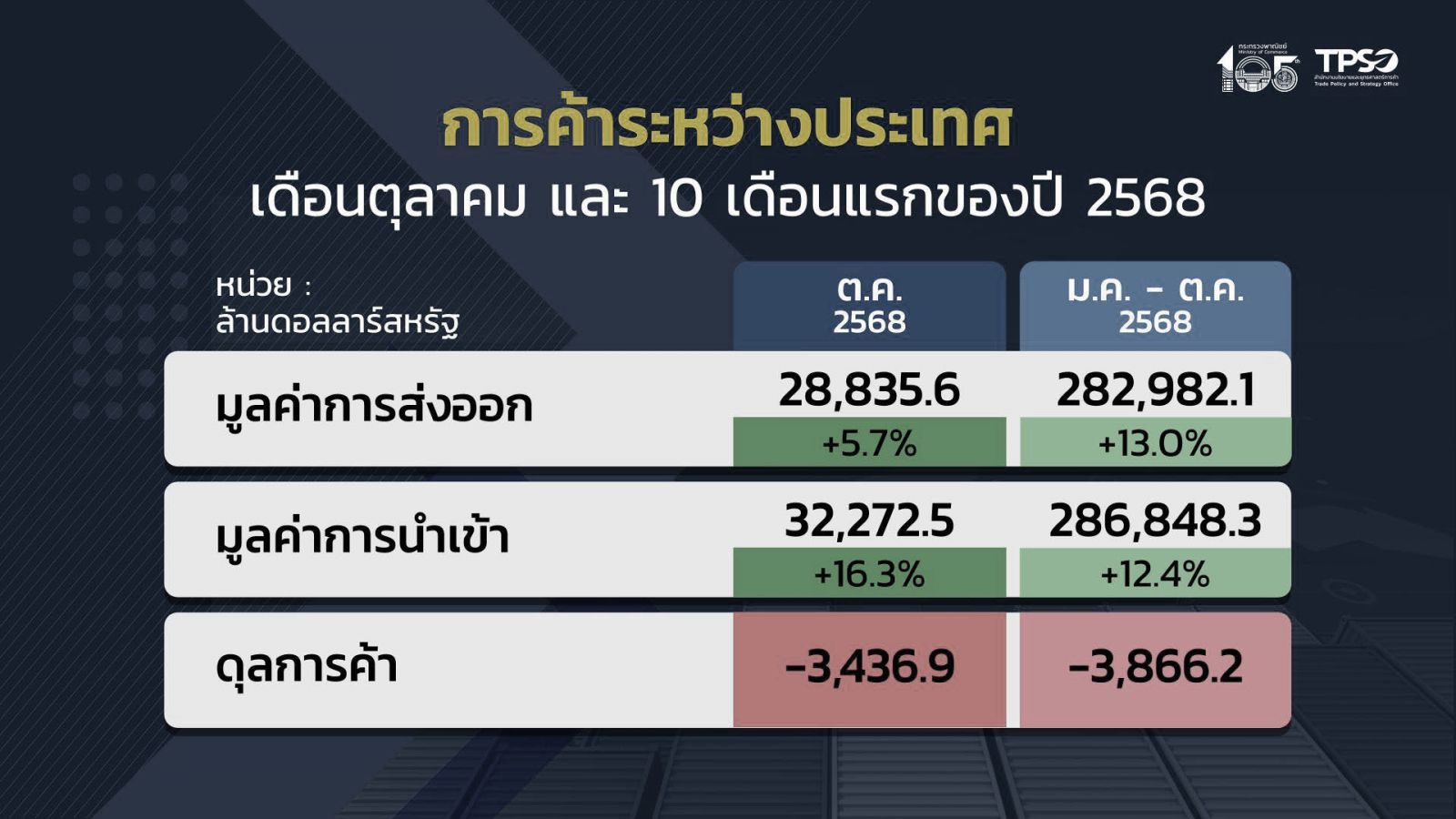 เดือนตุลาคม 2568 การส่งออก มีมูลค่า 28,835.6 ล้านดอลลาร์สหรัฐ ขยายตัวร้อยละ 5.7 เทียบกับเดือนเดียวกันของปีก่อน การนำเข้า มีมูลค่า 32,272.5 ล้านดอลลาร์สหรัฐ ขยายตัวร้อยละ 16.3 ดุลการค้า ขาดดุล 3,436.9 ล้านดอลลาร์สหรัฐ ภาพรวม 10 เดือนแรกของปี 2568 การส่งออก มีมูลค่า 282,982.1 ล้านดอลลาร์สหรัฐ ขยายตัวร้อยละ 13.0 เทียบกับช่วงเดียวกันของปีก่อน การนำเข้า มีมูลค่า 286,848.3 ล้านดอลลาร์สหรัฐ ขยายตัวร้อยละ 12.4 ดุลการค้า ขาดดุล 3,866.2 ล้านดอลลาร์สหรัฐ