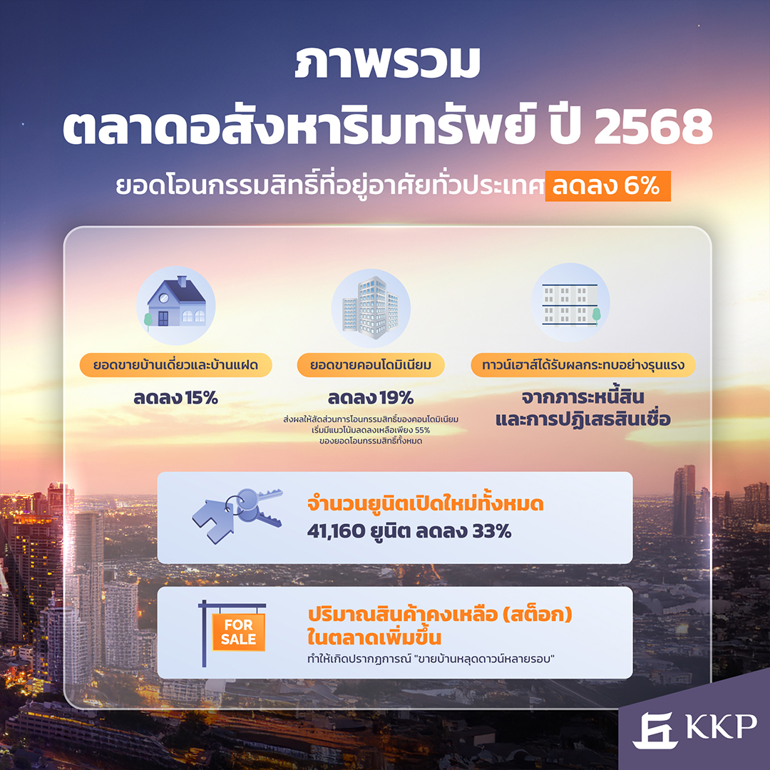 กรุงเทพฯ-สายงานสินเชื่อธุรกิจ ธนาคารเกียรตินาคินภัทร (KKP) เปิดภาพรวมตลาดอสังหาริมทรัพย์ไทยปี 2569 ส่งสัญญาณฟื้นตัว จากนโยบายเศรษฐกิจของรัฐบาลใหม่หลังการเลือกตั้ง และการลงทุนโครงสร้างพื้นฐานขนาดใหญ่ โดยประเมินว่าตลาดอสังหาริมทรัพย์ไทยในช่วงปี 2568–2569 จะยังอยู่ในช่วงปรับฐานและยอดขายยังไม่กลับสู่ระดับก่อนโควิด โดยเฉพาะเมื่อเทียบกับปี 2562 ที่ยอดขายในกรุงเทพฯ และปริมณฑลเคยแตะ 120,000 ยูนิตต่อปี ขณะที่แนวโน้มฟื้นตัวยังคาดว่าจะเป็นแบบค่อยเป็นค่อยไป โดยคาดว่าภาวะชะลอตัวจะยืดเยื้ออีก 2–3 ปี จากกำลังซื้อที่ยังอ่อนแรงและอุปทานคงค้างในระบบที่สูงโดยเฉพาะในกลุ่มบ้านหรูและคอนโดมิเนียม ทำให้ผู้ประกอบการจำเป็นต้องเร่งปรับกลยุทธ์ เจาะดีมานด์เฉพาะกลุ่ม คัดเลือกทำเลอย่างแม่นยำ และปรับตัวสู่การพัฒนาโครงการคาร์บอนต่ำเพื่อบริหารความเสี่ยงในสภาพตลาดที่ยังเปราะบาง และเพิ่มความสามารถในการแข่งขัน