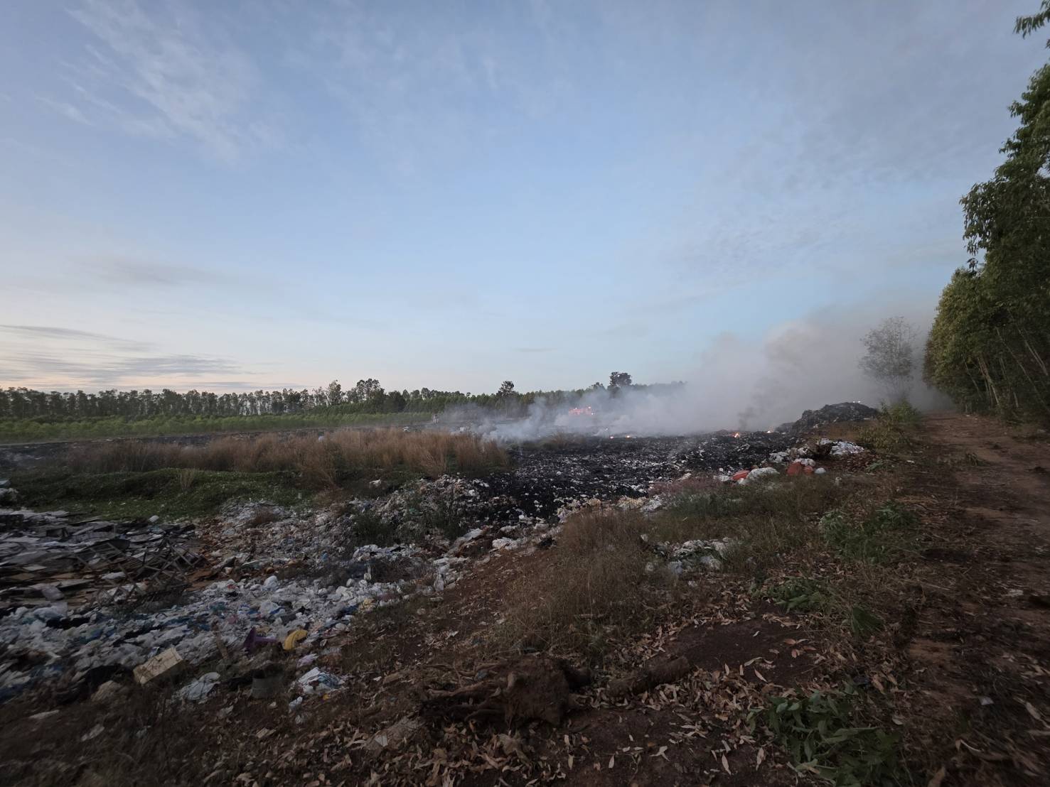 ควันพิษ! ไฟไหม้บ่อขยะอิเล็กทรอนิกส์ นอภ.ศรีมหาโพธิ์ระดมรถดับเพลิงช่วยดับ