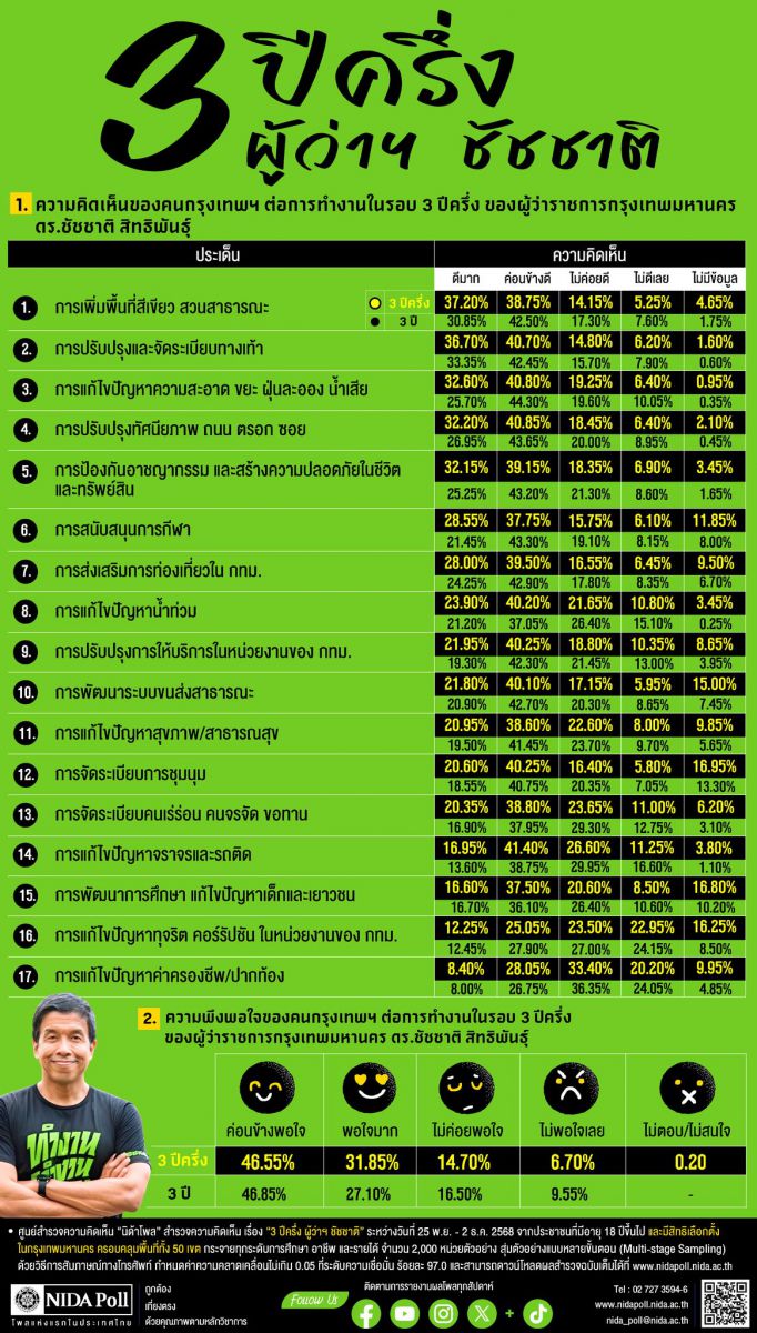 นิด้าโพลสำวจผลงาน3ปีครึ่งผู้ว่าฯชัชชาติ สอบผ่านฉลุย17ประเด็นผลงานของกทม.