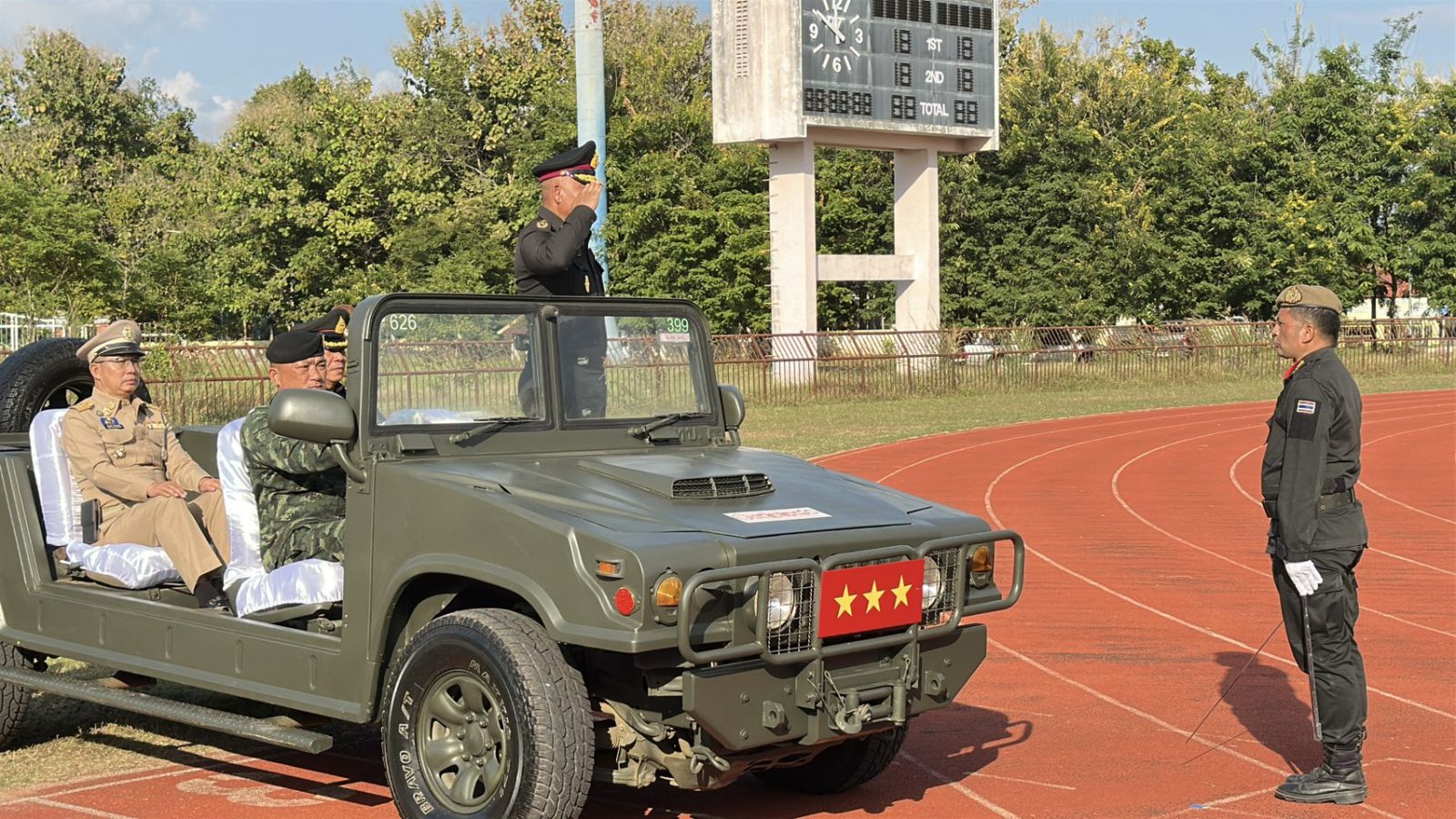 อย่างไรก็ตามเนื่องจากวันนี้มีการรบที่ชายแดนไทยกัมพูชาไม่ว่าจะเป็นทหารจากกองทัพ ภาคที่ 2 กองทัพภาคที่ 1 โดยเฉพาะสี่จังหวัดอีสานใต้ได้แก่จังหวัดศรีสะเกษ จ.สุรินทร์ จ.อุบลราชธานีและ จ.บุรีรัมย์ คณะผู้ร่วมเดินสวนสนามรวมไปถึงประชาชนที่เข้าร่วมในพิธีต่างร่วมส่งกำลังใจต่อทหารที่กำลังปฏิบัติหน้าที่ปกป้องอธิปไตยดินแดนของชาติในครั้งนี้