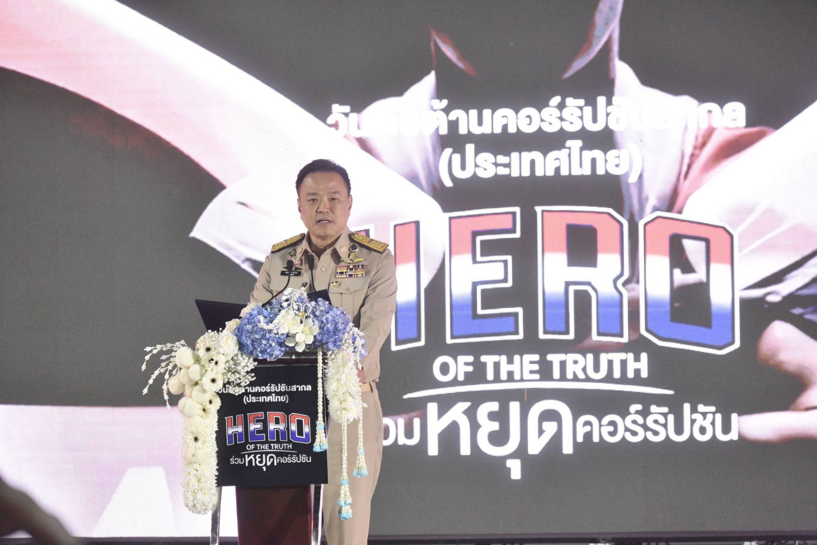 จากนั้น นายกรัฐมนตรีแสดงสัญลักษณ์ต่อต้านการทุจริต โดยการเปิดผ้าคลุมสัญลักษณ์ “HERO OF THE TRUTH ร่วมหยุดคอร์รัปชัน” เพื่อเป็นการแสดงเจตนารมณ์อย่างแน่วแน่ของทุกหน่วยงานในการต่อต้านการทุจริตคอร์รัปชันไม่ว่าจะเป็นในรูปแบบใด