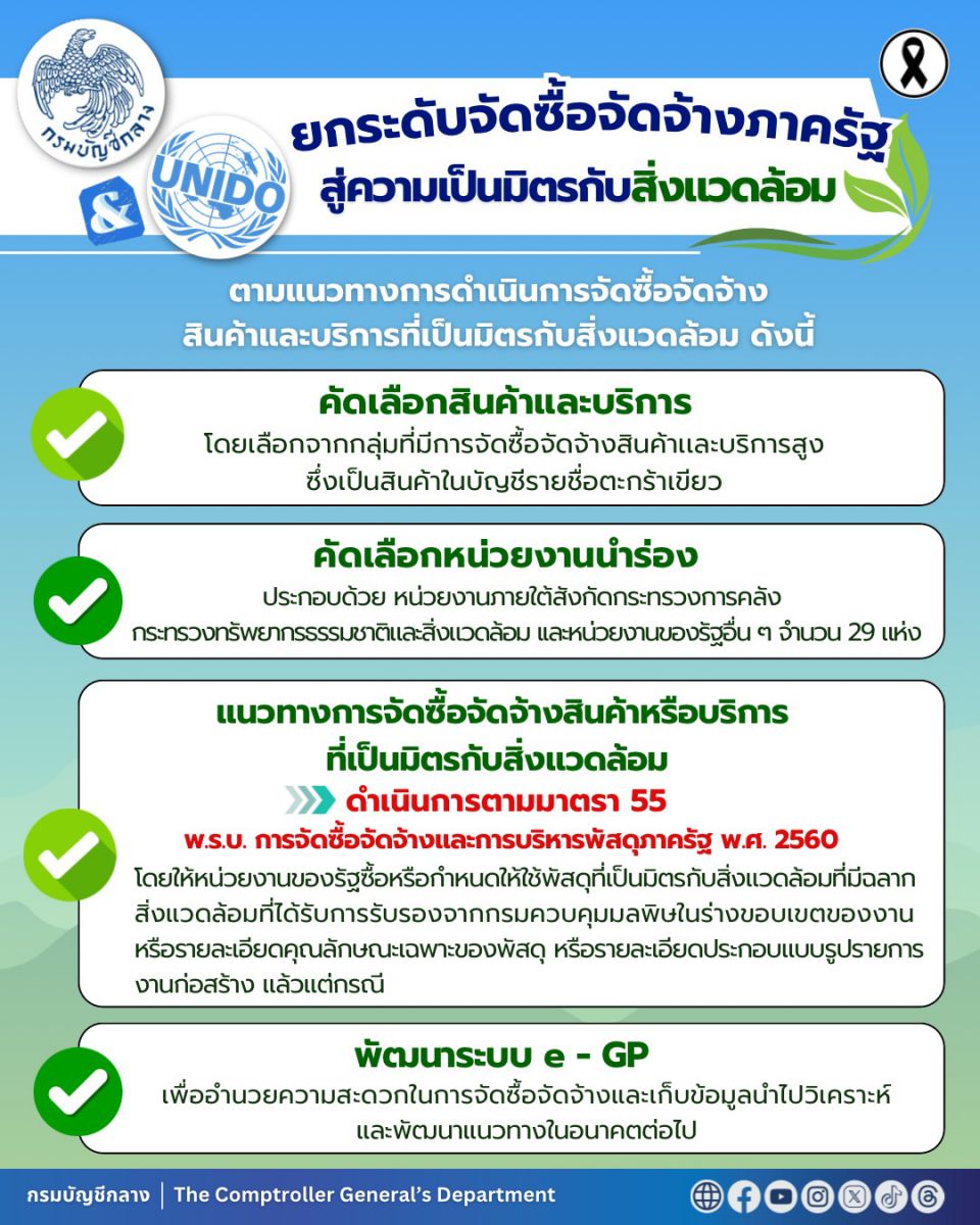 โดยกรมบัญชีกลางได้กำหนดแนวทางในการส่งเสริมการจัดซื้อจัดจ้างสินค้าที่เป็นมิตรกับสิ่งแวดล้อมอย่างเป็นระบบ ตั้งแต่การจัดทำยุทธศาสตร์ การคัดเลือกกลุ่มสินค้าและบริการที่มีความพร้อมทั้งด้านตลาดและมาตรฐานสิ่งแวดล้อมเพื่อใช้เป็นสินค้านำร่อง ไปจนถึงการกำหนดแนวทางปฏิบัติให้หน่วยงานของรัฐสามารถดำเนินการได้อย่างถูกต้องตามกฎหมาย นอกจากนี้ กรมบัญชีกลางยังได้คัดเลือกหน่วยงานนำร่องเพื่อร่วมผลักดันให้มีการใช้สินค้าที่เป็นมิตรกับสิ่งแวดล้อมในวงกว้าง และปรับปรุงระบบ e-GP เพื่อรองรับการจัดซื้อสินค้าเขียวและการติดตามผลการดำเนินงานให้เป็นไปอย่างมีประสิทธิภาพ โปร่งใส และทันสมัย