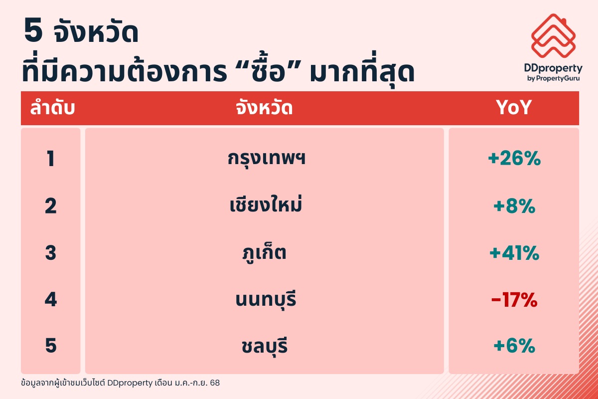 สะท้อนได้จากผู้เข้าชมเว็บไซต์ DDproperty พบว่า ความต้องการซื้อยังมีอยู่ ในช่วง 9 เดือนแรกของปี 2568 ความต้องการซื้อใน 5 จังหวัดแรกที่มีผู้เข้าชมมากที่สุด ส่วนใหญ่เพิ่มขึ้นจากปีก่อนหน้า โดยความต้องการซื้อในกรุงเทพฯ เพิ่มขึ้นมากที่สุดถึง 26% YoY สะท้อนให้เห็นว่า ผู้บริโภคยังคงให้ความสนใจซื้อที่อยู่อาศัย เพียงรอช่วงเวลาที่เหมาะสมทั้งในแง่ความพร้อมทางการเงินและมาตรการรัฐที่เอื้อต่อการซื้อที่อยู่อาศัย