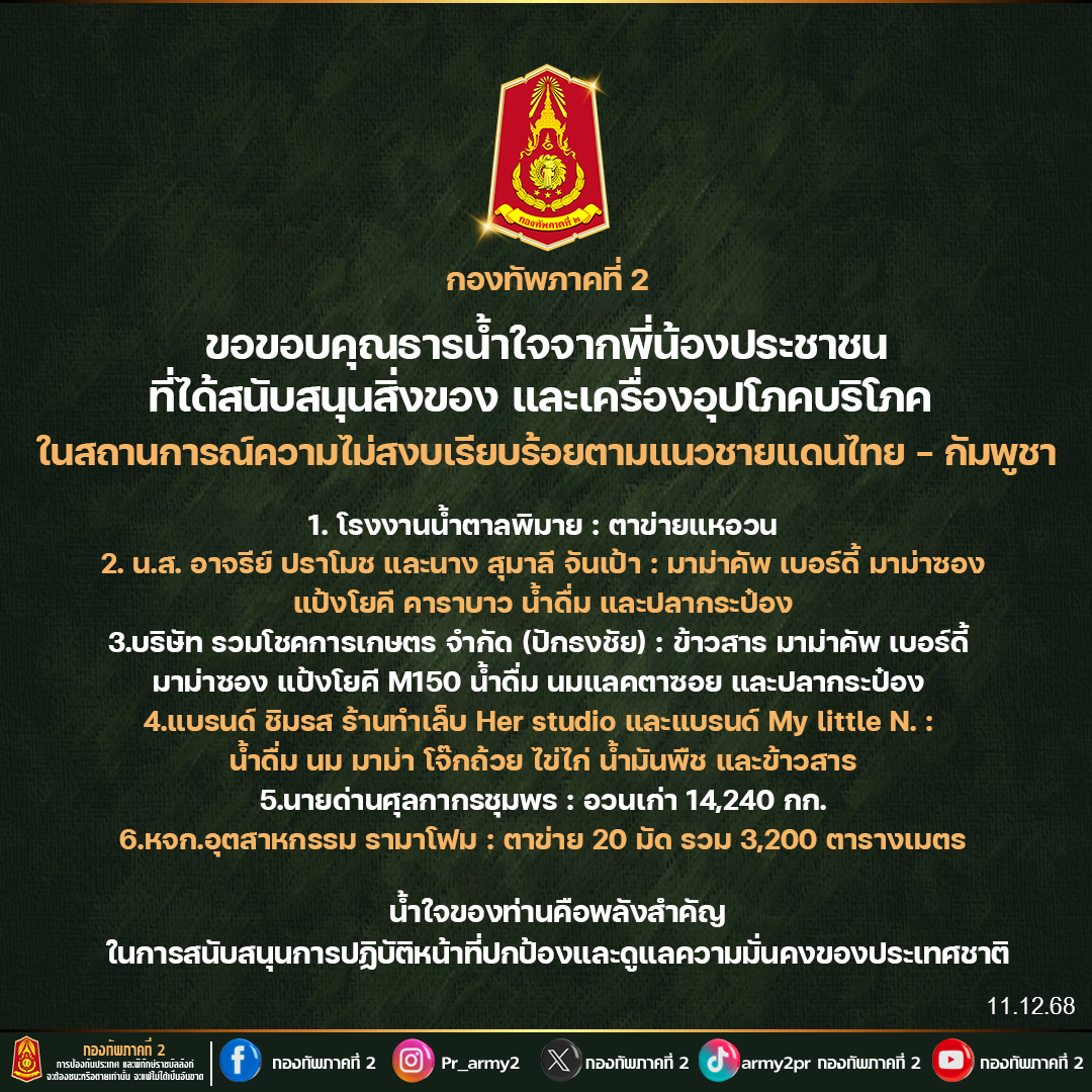 ศูนย์อำนวยการจิตอาสาพระราชทาน ภาค 2 ขอสรุปผลการช่วยเหลือประชาชนที่ได้รับผลกระทบจากสถานการณ์ชายแดนไทย - กัมพูชา เพื่อสร้างความเชื่อมั่นให้พี่น้องประชาชน ดังนี้