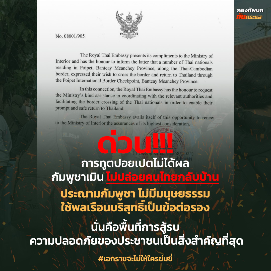 ศูนย์ปฏิบัติการกองทัพภาคที่ 2 สรุปสถานการณ์ตามแนวชายแดนไทย-กัมพูชา ประจำวันที่ 11 ธันวาคม 2568 (เวลา 1700) ส่วนสถานการณ์พื้นที่ชายแดนจังหวัดสระแก้ว กองทัพภาคที่1 เปิด3 แนวรบหลัก ตรึงกำลังและมีการปะทะปะปราย