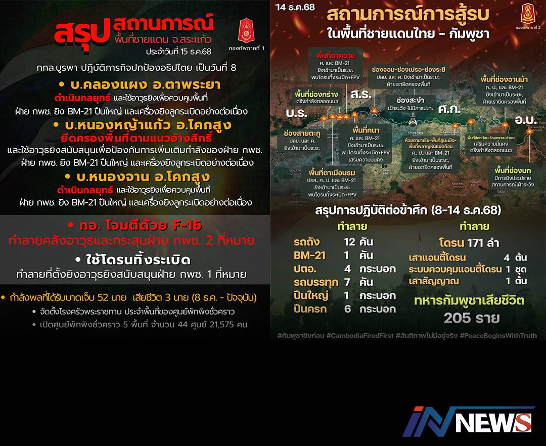 ศูนย์ปฏิบัติการกองทัพภาคที่ 1 สรุปสถานการณ์ชายแดนไทย-กัมพูชา พื้นที่ จ.สระแก้ว ประจำวัน 15 ธันวาคม 2568 เวลา 18.00 น.