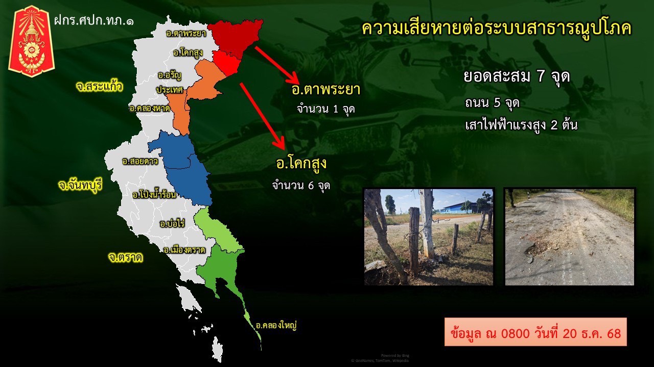 ศูนย์ปฏิบัติการกองทัพภาคที่ 1 สรุปสถานการณ์ชายแดนไทย-กัมพูชา พื้นที่ จ.สระแก้ว ประจำวัน 20 ธันวาคม 2568 เวลา 18.00 น.