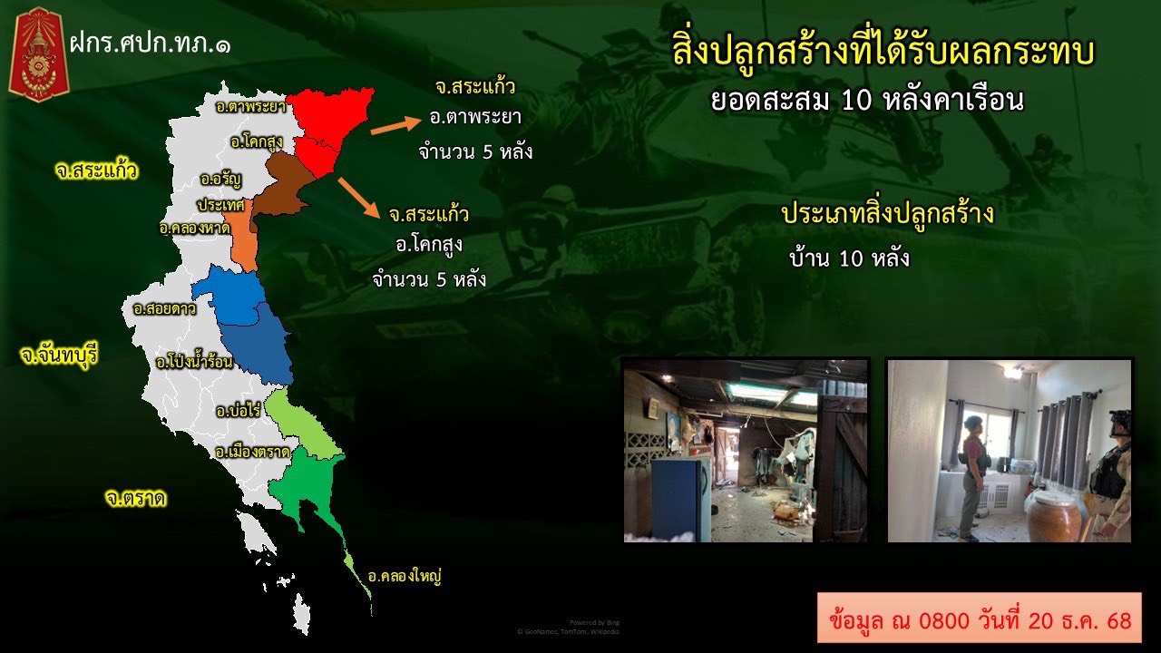 สรุปพื้นที่ที่ได้รับความเสียหาย จากฝ่ายกัมพูชาได้ยิง BM-21 และเครื่องยิงลูกระเบิด เข้ามายังพื้นทึ่ชายแดน จ.สระแก้ว(ตั้งแต่ 8 - 20 ธ.ค.68)ดังนี้