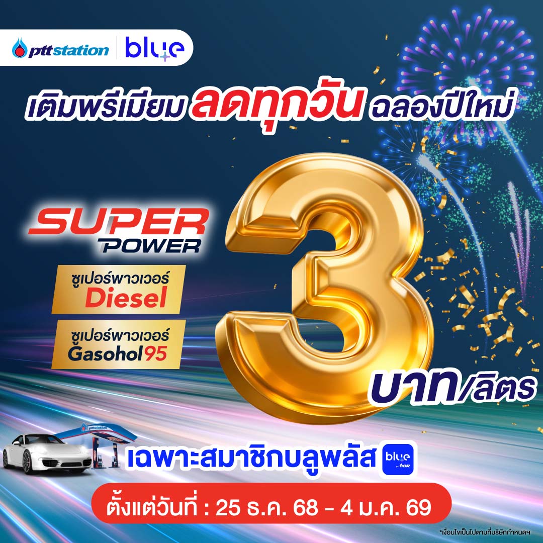 ·สถานีบริการ พีทีที สเตชั่น จัดโปรโมชันพิเศษ เมื่อเติมน้ำมันทุกชนิดครบ 500 บาท รับฟรี น้ำดื่ม 1 ขวด ตั้งแต่วันที่ 1 ธ.ค. 68 – 31 ม.ค. 69 และพิเศษสำหรับสมาชิกบลูพลัส+ (blueplus+) รับส่วนลดทันที 3 บาทต่อลิตร เมื่อเติมน้ำมันเกรดพรีเมียม Super Power ทุกชนิดตั้งแต่วันที่ 25 ธ.ค. 68 - 4 ม.ค. 69 รวมทั้ง เมื่อเติมน้ำมันทุกชนิดครบ 500 บาทขึ้นไป รับฟรีประกันอุบัติเหตุคุ้มครองสูงสุด 100,000 บาท ตั้งแต่วันที่ 25 ธ.ค. 68 - 4 ม.ค. 69 นอกจากนี้ สำหรับกลุ่มรถใหญ่ เมื่อเติมน้ำมันทุกชนิดครบ 150 ลิตร รับส่วนลด 0.50 บาทต่อลิตร หรือ เมื่อเติมครบ 200 ลิตร รับส่วนลด 0.60 บาทต่อลิตร ตั้งแต่วันที่ 1 - 31 ธ.ค. 68
