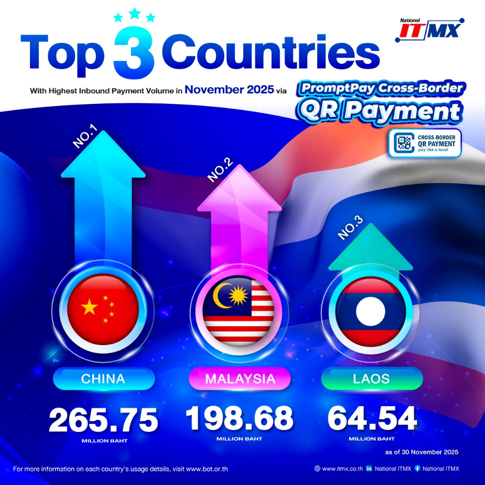 จีนก้าวขึ้นมาเป็นประเทศที่มีมูลค่าธุรกรรมขาเข้าสูงสุดในเดือนพฤศจิกายน เป็นผลมาจากการ ขยายความร่วมมือด้านการเชื่อมต่อระบบการชำระเงินข้ามพรมแดน ในช่วงที่ผ่านมา ทำให้ผู้ใช้งานจากประเทศจีนสามารถใช้แอปพลิเคชันชำระเงินในประเทศของตน สแกน QR Code เพื่อชำระค่าสินค้าและบริการในประเทศไทยได้อย่างสะดวกและราบรื่นมากยิ่งขึ้น ความพร้อมของระบบดังกล่าวช่วยลดอุปสรรคในการใช้จ่ายของนักท่องเที่ยวจีน ทั้งในด้านความคุ้นเคยของช่องทางการชำระเงิน ความปลอดภัย และความสะดวกในการแปลงสกุลเงิน สะท้อนให้เห็นถึงศักยภาพของการเชื่อมต่อระบบการชำระเงินข้ามพรมแดนในการสนับสนุนภาคการท่องเที่ยวและเศรษฐกิจของไทยในระยะต่อไป