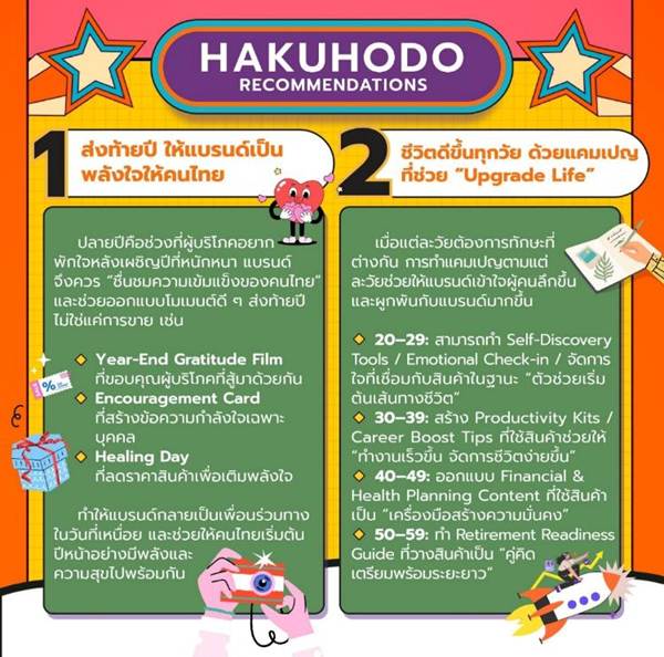 ปลายปี คือช่วงเวลาที่ผู้บริโภคอยากพักใจหลังเผชิญกับความหนักหนามาตลอดทั้งปี แบรนด์จึงควร ‘ชื่นชมความเข้มแข็งของคนไทย’ และช่วยออกแบบโมเมนต์ดี ๆ ส่งท้ายปี ที่ไม่ใช่แค่การขายเพียงอย่างเดียว เช่น Year-End Gratitude Film ที่ขอบคุณผู้บริโภคที่สู้มาด้วยกัน หรือ Encouragement Card ที่สร้างข้อความให้กำลังใจเฉพาะบุคคล หรือ Healing Day ที่ลดราคาสินค้าเพื่อเติมพลังใจให้แก่ผู้บริโภค การทำสิ่งเหล่านี้ จะทำให้แบรนด์กลายเป็นเพื่อนร่วมทางในวันที่เหนื่อยล้า และช่วยให้คนไทยเริ่มต้นปีหน้าได้อย่างมีพลังและมีความสุขไปพร้อมกัน