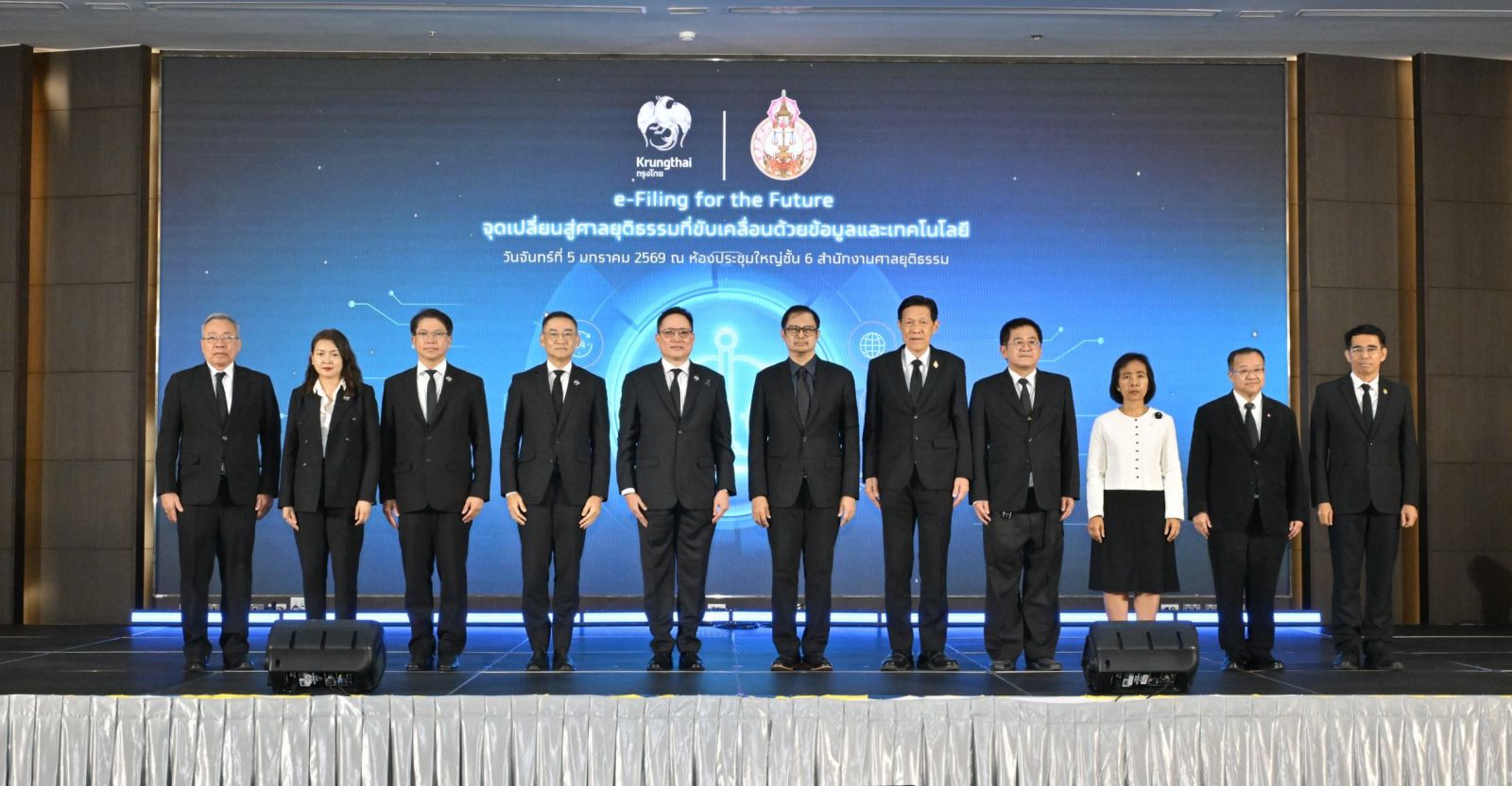 เมื่อวันที่ 5 มกราคม 2569เวลา 13.30 ณ ห้องประชุมใหญ่ชั้น 6 อาคารสำนักงานศาลยุติธรรม ถ.รัชดาภิเษกนายธีรทัย เจริญวงศ์ เลขาธิการสำนักงานศาลยุติธรรม พร้อมด้วยนายผยง ศรีวณิช กรรมการผู้จัดการใหญ่ ธนาคารกรงุไทย จำกัด (มหาชน) ได้เข้าร่วมงาน “e-Filing for the Future: จุดเปลี่ยนสู่ศาลยุติธรรมที่ขับเคลื่อนด้วยข้อมูลและเทคโนโลยี” ซึ่งจัดขึ้นเพื่อเป็นหมุดหมายสำคัญในการยกระดับพัฒนาระบบรับส่งอิเล็กทรอนิกส์ (e-Filing)ของศาลยุติธรรม