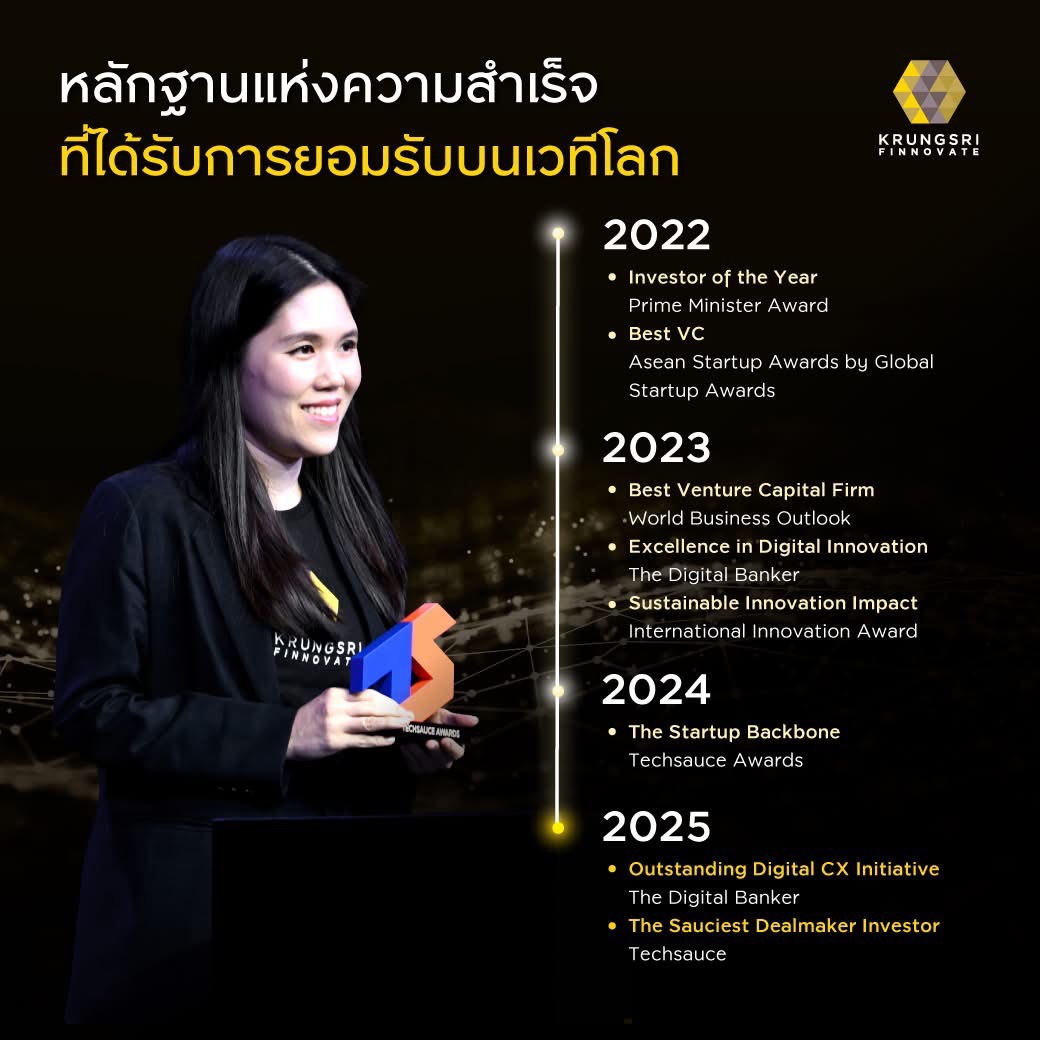 ความสำเร็จของ Krungsri Finnovate ตลอดปี 2025 ได้รับการยอมรับผ่านเวทีระดับโลก อาทิ รางวัล Outstanding Digital CX Initiative จาก The Digital Banker และรางวัล The Sauciest Dealmaker Investor จาก Techsauce Awards ซึ่งเป็นการต่อยอดความสำเร็จจากรางวัล "Investor of the Year" และ "Best VC" ในปีก่อนหน้า ตอกย้ำสถานะ "Startup Backbone" ที่แข็งแกร่งที่สุดในประเทศไทย