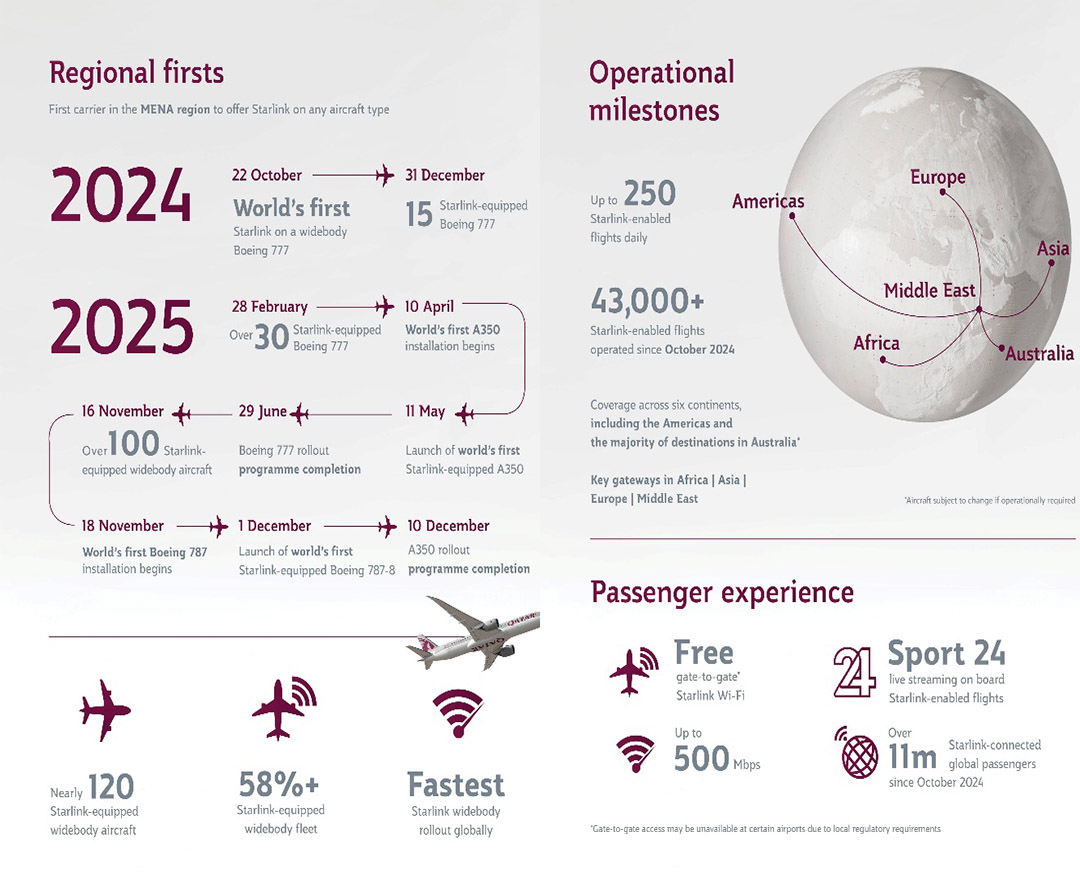 ในปี 2025 Starlink ได้ให้บริการผู้โดยสารมากกว่า 21 ล้านคนบนสายการบินทั่วโลก โดยผู้โดยสารของ กาตาร์ แอร์เวย์ส ที่ใช้งาน Starlink คิดเป็นเกือบครึ่งของจำนวนทั้งหมด หรือมากกว่า 10 ล้านคน ซึ่งถือเป็นสายการบินแรกของโลกที่ให้บริการอินเทอร์เน็ตความเร็วสูงแบบไม่มีค่าใช้จ่ายบนเครื่องบินลำตัวกว้าง สำหรับเที่ยวบินระยะไกลและระยะไกลพิเศษ