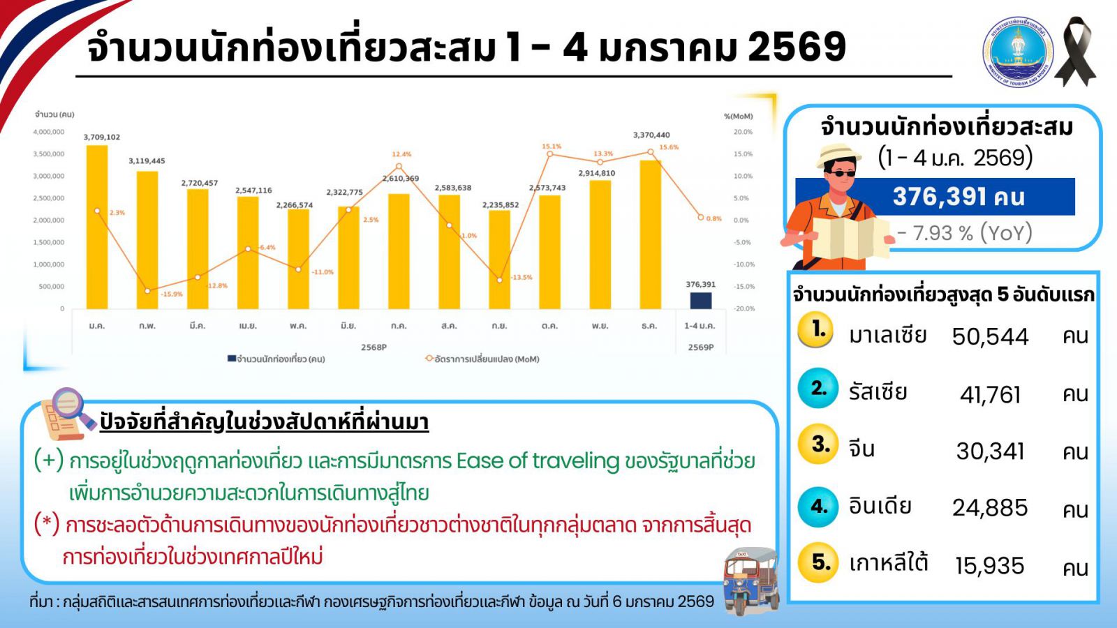 ตั้งแต่วันที่ 1 มกราคม - 31 ธันวาคม 2568 #มีนักท่องเที่ยวชาวต่างชาติเดินทางมาท่องเที่ยวประเทศไทยจำนวน 32.97 ล้านคน หดตัวร้อยละ 7.23 เมื่อเปรียบเทียบกับช่วงเวลาเดียวกันของปีที่ผ่านมา #สร้างรายได้ 1.53 แสนล้านบาท หดตัวร้อยละ 4.71 เมื่อเปรียบเทียบกับช่วงเวลาเดียวกันของปีที่ผ่านมา