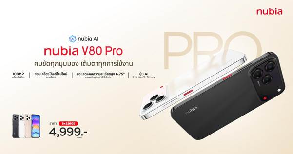 nubia V80 Pro สมาร์ตโฟนกล้อง 108MP ตอบโจทย์ประสิทธิภาพการทำงานและการสร้างสรรค์คอนเทนต์ รุ่นนี้ออกแบบมาเพื่อผู้ใช้งานที่มองหาสมาร์ตโฟนสเปกครบในราคาคุ้ม มาพร้อมกล้องหลัก AI 108MP, ความจุ RAM 8GB + ROM 256GB, หน้าจอขนาด 6.75 นิ้ว HD+ ความสว่างสูงสุด 1000nits และแบตเตอรี่ขนาดใหญ่ 5000mAh รองรับชาร์จไว 22.5W บนระบบปฏิบัติการ Android 15 ตอบโจทย์ทั้งสายถ่ายรูป สายทำงาน และครีเอเตอร์มือใหม่มีให้เลือก 2 สี: Feather Black และ Petal Gold ราคาเปิดตัว: 8+256GB เพียง 4,999 บาท