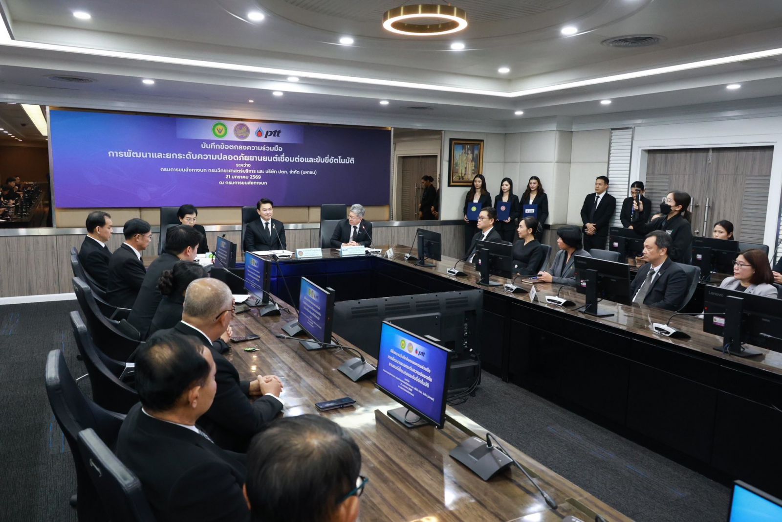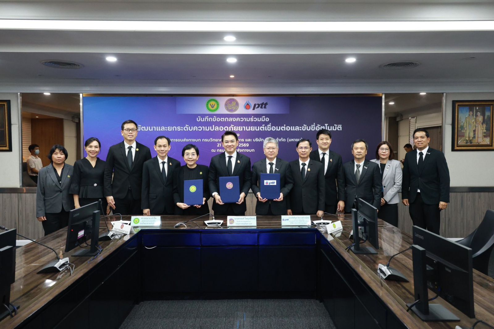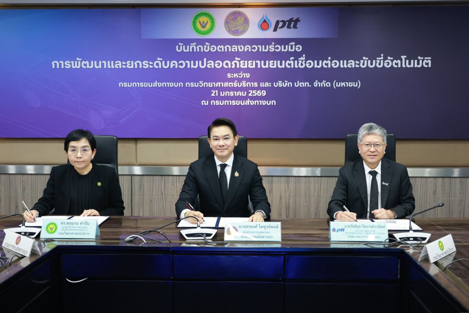นายสรพงศ์ ไพฑูรย์พงษ์ อธิบดีกรมการขนส่งทางบก(ขบ.) กระทรวงคมนาคม พร้อมด้วยนางพจมาน ท่าจีน รองอธิบดี รักษาราชการแทนอธิบดีกรมวิทยาศาสตร์บริการ(วศ.) และนายรัตติกูล ปิยะวงค์วาณิชย์ รองกรรมการผู้จัดการใหญ่วิศวกรรมโครงการและการปฏิบัติการสู่ความเป็นเลิศ บริษัท ปตท. จำกัด (มหาชน) ลงนามข้อตกลงความร่วมมือพัฒนาและยกระดับความปลอดภัยยานยนต์เชื่อมต่อและขับขี่อัตโนมัติ (Connected and Autonomous Vehicle: CAV) เพื่อร่วมกันขับเคลื่อนการพัฒนาและยกระดับความปลอดภัยในการใช้งาน CAV อย่างครบวงจร ตั้งแต่การศึกษาวิจัย การพัฒนา การทดสอบ และการอนุญาตใช้งาน ไปจนถึงการสร้างความเชื่อมั่นแก่ประชาชน โดยมุ่งสนับสนุนการจัดทำมาตรฐาน ข้อกำหนด และกฎหมายที่เกี่ยวข้องให้สอดคล้องกับมาตรฐานสากล ควบคู่กับการพัฒนาและเสริมสร้างศักยภาพบุคลากร เพื่อรองรับการนำเทคโนโลยียานยนต์สมัยใหม่มาใช้อย่างปลอดภัยและเหมาะสมกับบริบทของประเทศไทย ในวันที่ 21 มกราคม 2569 ณ กรมการขนส่งทางบก