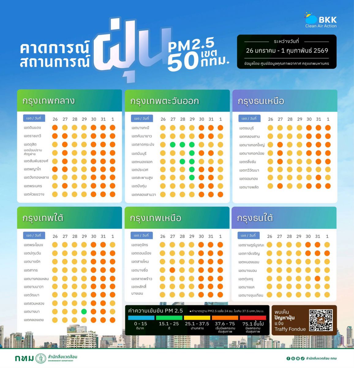 กรุงเทพฯ-คุณภาพอากาศ กทม. อยู่ในเกณฑ์ปานกลาง PM.2.5 ค่าเฉลี่ย 32.2 มคก./ลบ.ม.ทั่วกรุงเทพฯ ฝุ่นเกินมาตรฐาน อยู่ในระดับสีส้ม 9 เขต ศูนย์ข้อมูลคุณภาพอากาศกรุงเทพมหานครขอสรุปผลการตรวจวัด PM2.5 ประจำวันที่ 25 มกราคม 2569 เวลา 07.00 น. ตรวจวัดได้ 22.6-48.0 มคก./ลบ.ม. ค่าเฉลี่ยของกรุงเทพมหานคร 32.2 มคก./ลบ.ม. (ค่ามาตรฐานไม่เกิน 37.5 มค.ก./ลบ.ม.)ค่า PM2.5 มีแนวโน้มเพิ่มขึ้น เกินมาตรฐานจำนวน 10 พื้นที่