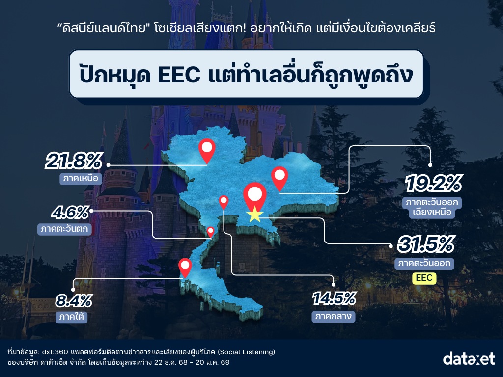 แม้ตามแผนแม่บทของภาครัฐจะมุ่งเป้าไปที่พื้นที่เขตพัฒนาพิเศษภาคตะวันออก หรือ EEC (Eastern Economic Corridor) แต่เสียงจากโซเชียลสะท้อนว่ามีการพูดถึงทำเลศักยภาพกระจายไปยัง 6 โซนทั่วประเทศ โดยเรียงตามสัดส่วนการกล่าวถึง (Mention) ได้แก่