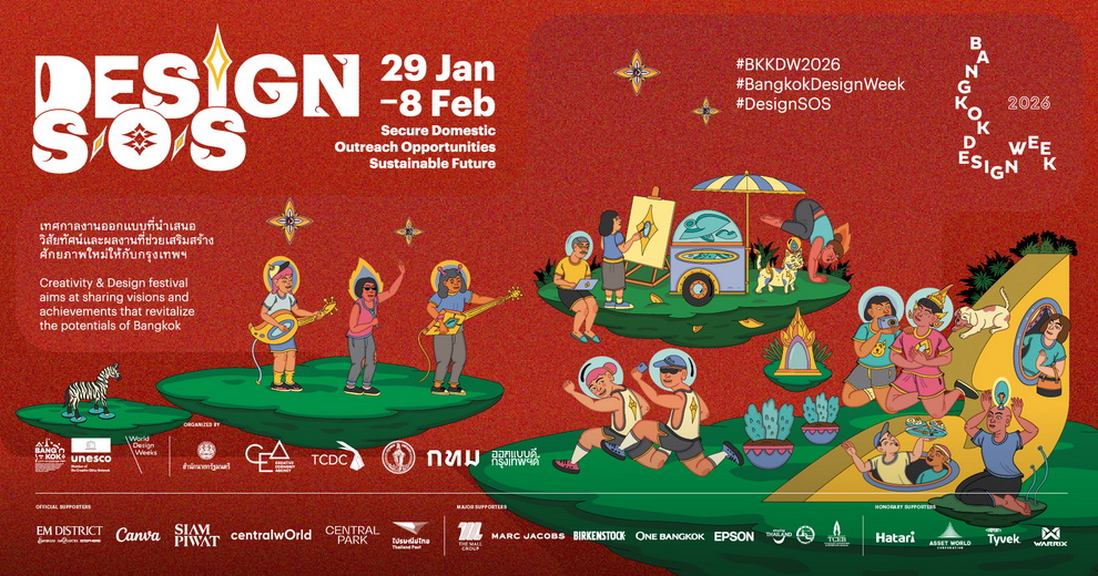Bangkok Design Week 2026 จัดขึ้นภายใต้แนวคิดหลัก “DESIGN S/O/S” ซึ่งสะท้อนบทบาทของการออกแบบในฐานะเครื่องมือในการขับเคลื่อนเศรษฐกิจ สังคม และคุณภาพชีวิต ผ่าน 3 แกนสำคัญ ได้แก่ Secure Domestic, Outreach Opportunities และ Sustainable Future โดยตลอดระยะเวลา 11 วันของการจัดงาน ผู้เข้าชมจะได้พบกับกิจกรรมสร้างสรรค์กว่า 350 กิจกรรม ที่กระจายอยู่ใน 4 ย่านหลัก ได้แก่ ย่านเจริญกรุง–ตลาดน้อยย่านพระนคร ย่านปากคลองตลาด และย่านบางลำพู–ข้าวสาร รวมถึงพื้นที่อื่น ๆ ทั่วกรุงเทพฯ