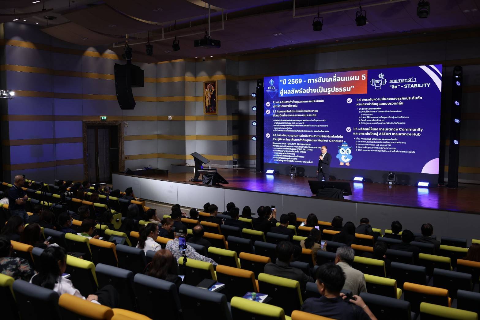 เลขาธิการ คปภ. กล่าวว่า ปี 2569 ถือเป็นจุดเริ่มต้นสำคัญของการขับเคลื่อนแผนพัฒนาการประกันภัย ฉบับที่ 5 จากวิสัยทัศน์สู่การปฏิบัติจริง โดยมุ่งยกระดับระบบประกันภัยจากเครื่องมือทางเลือก สู่การเป็น “โครงสร้างพื้นฐานด้านความมั่นคงของประเทศ” และเป็น “National Risk Buffer” หรือกลไกรองรับแรงกระแทกจากความเสี่ยงที่อาจเกิดขึ้นกับเศรษฐกิจและสังคม เพื่อให้ประชาชนสามารถเข้าถึงการประกันภัยได้อย่างทั่วถึง ใช้เป็นเครื่องมือสร้างความมั่นคงในชีวิตและทรัพย์สิน และให้ระบบประกันภัยไทยสามารถรองรับความเสี่ยงใหม่และภัยพิบัติขนาดใหญ่ได้อย่างมีประสิทธิภาพ ในปี 2569 จึงเป็นปีแห่งการ “แปลงแผนสู่ผลลัพธ์ที่จับต้องได้” โดยสำนักงาน คปภ. จะดำเนินงานภายใต้ 4 ยุทธศาสตร์หลัก ซึ่งการขับเคลื่อนในปี 2569 หัวใจคือการทำให้ระบบประกันภัยไทย “อึด – รับ – ทั่ว – ล้ำ” โดยมี คน เป็นกลไกสำคัญในการขับเคลื่อนองค์กร ข้อมูล เป็นฐานในการวิเคราะห์และกำหนดนโยบาย เทคโนโลยี เป็นเครื่องมือในการยกระดับประสิทธิภาพ และ การบูรณาการ ความร่วมมือจากทุกภาคส่วน ผ่านการติดตามและการวิเคราะห์ตามบริบทธุรกิจประกันภัยอย่างสม่ำเสมอ ซึ่งการดำเนินการที่สำคัญของสำนักงาน คปภ. ประจำปี 2569 แบ่งตามหมวดยุทธศาสตร์ตามแผน 5 ดังนี้